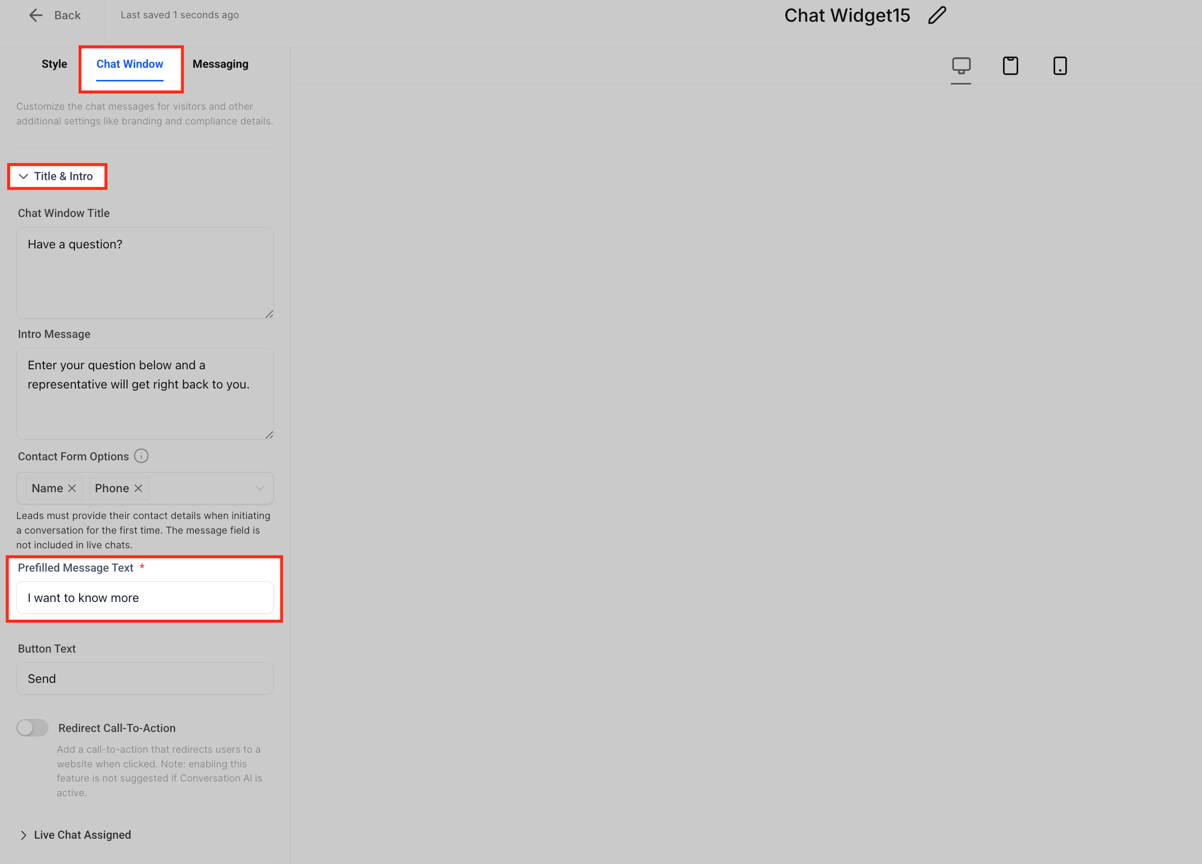 Here, you can edit the Chat Window Title, add an Intro Message, and define a Prefilled Message Text—a default message visitors see when starting a chat, which they can edit before sending.