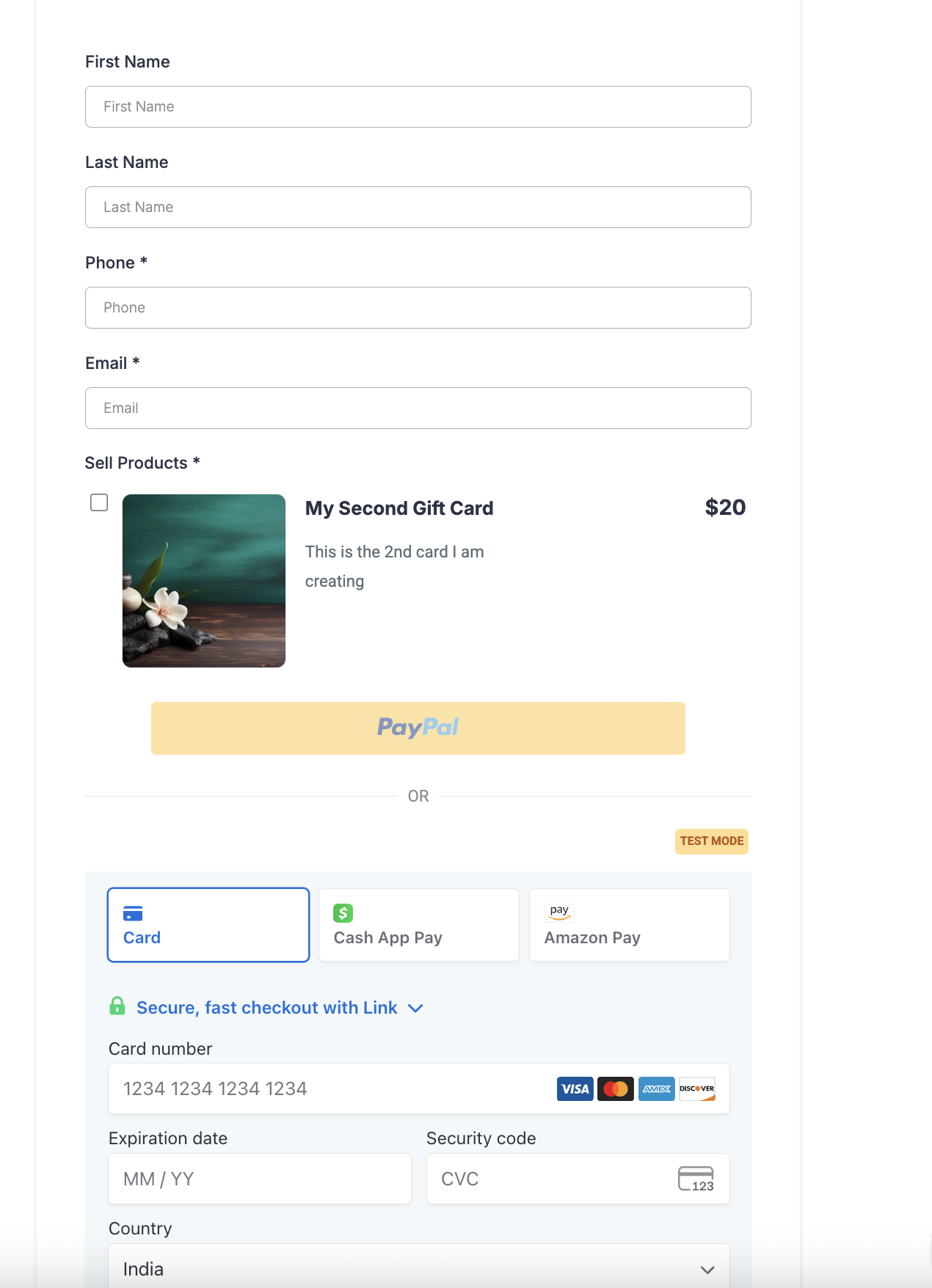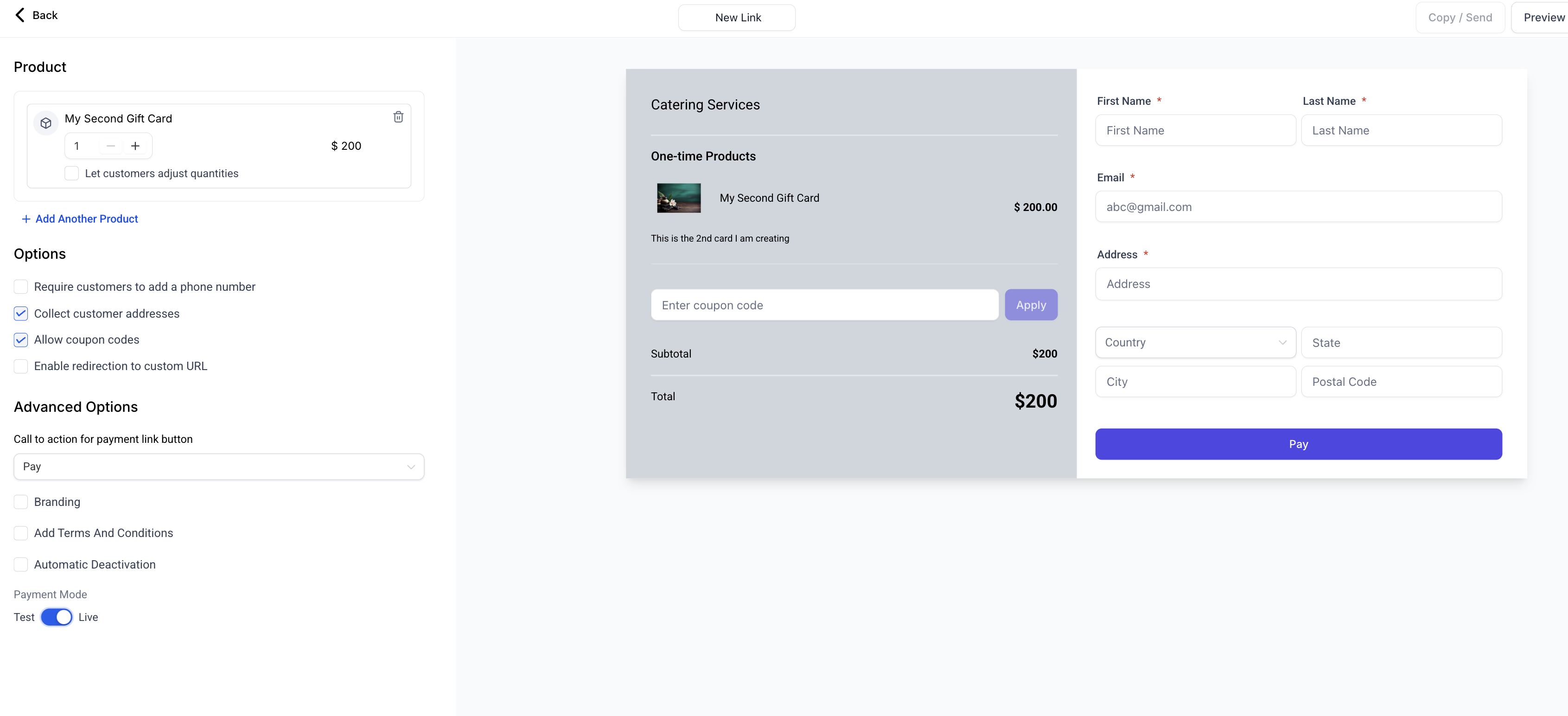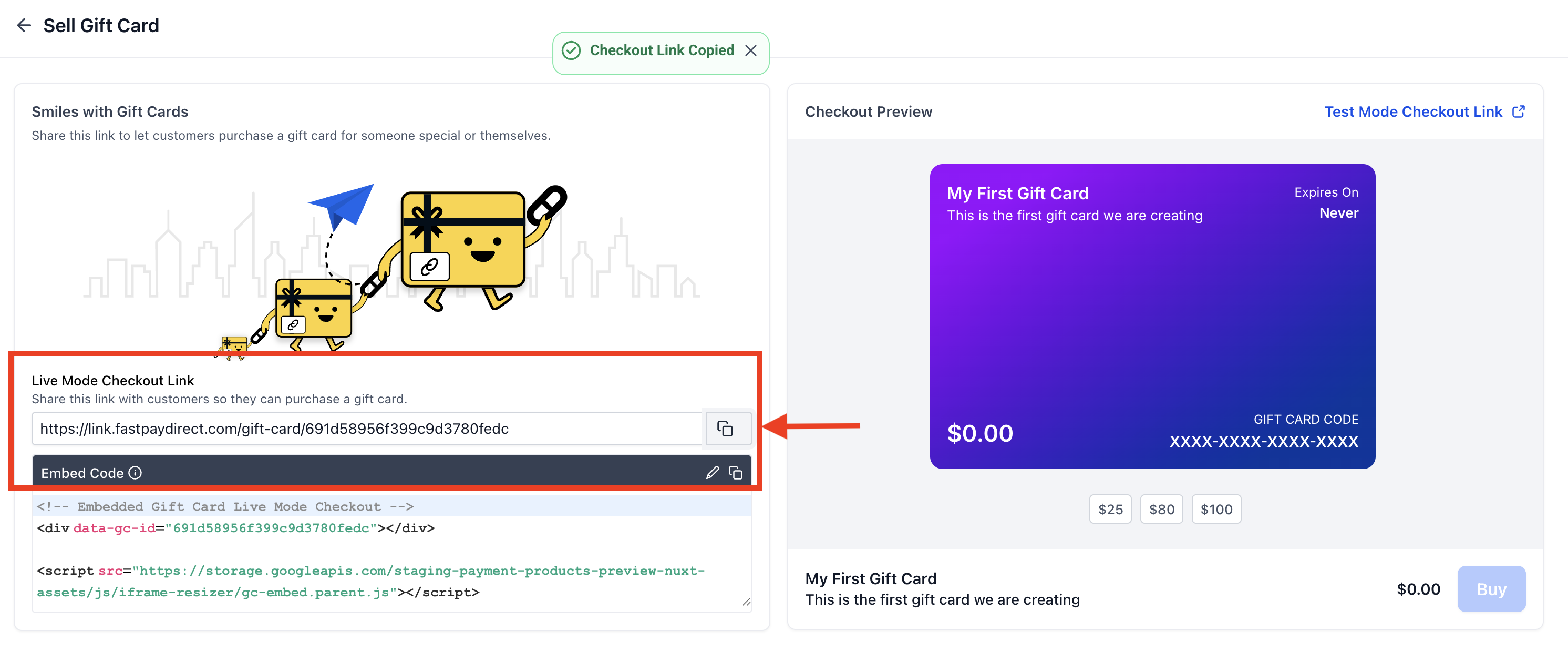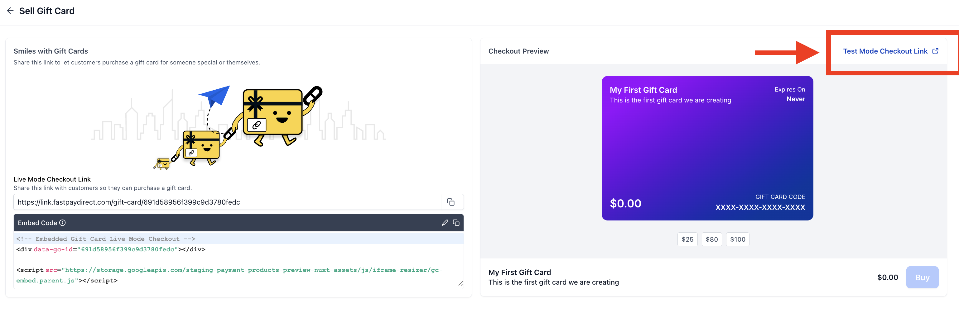 Each Gift Card Product has its own unique checkout link in both Test and Live modes.