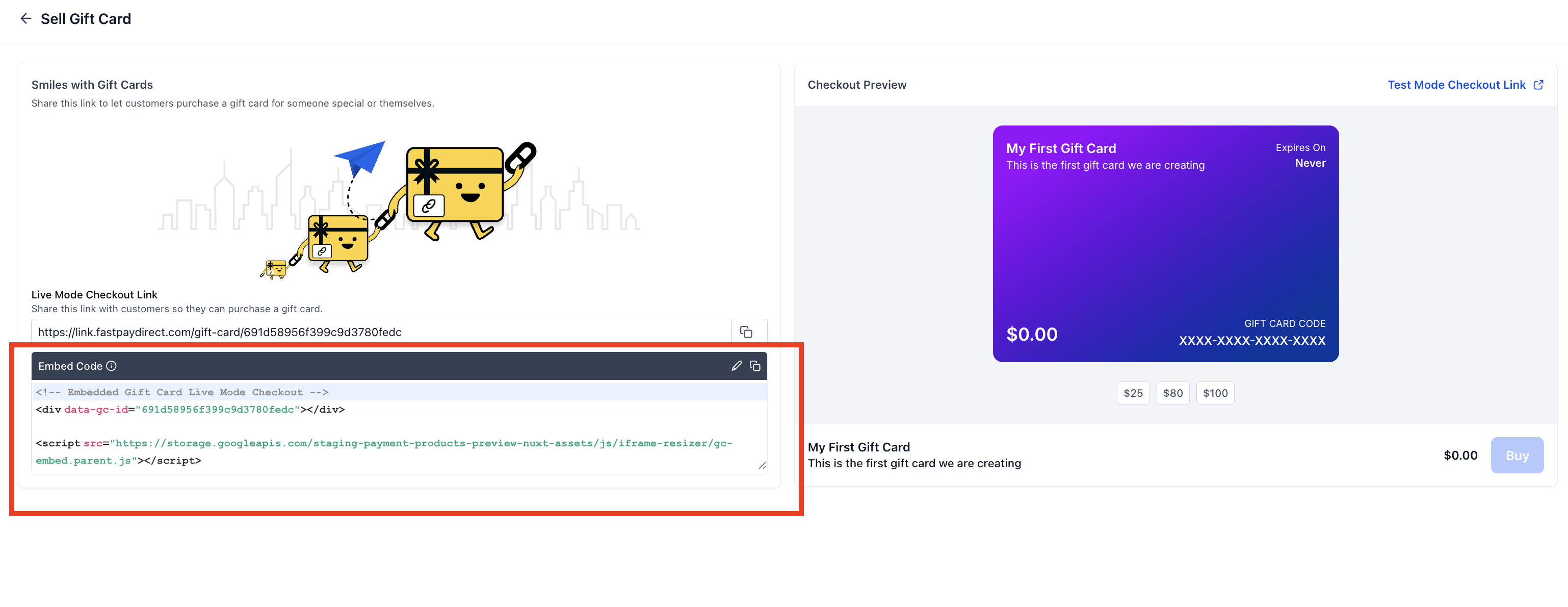 You can embed the dedicated gift card checkout directly onto any external webpage.