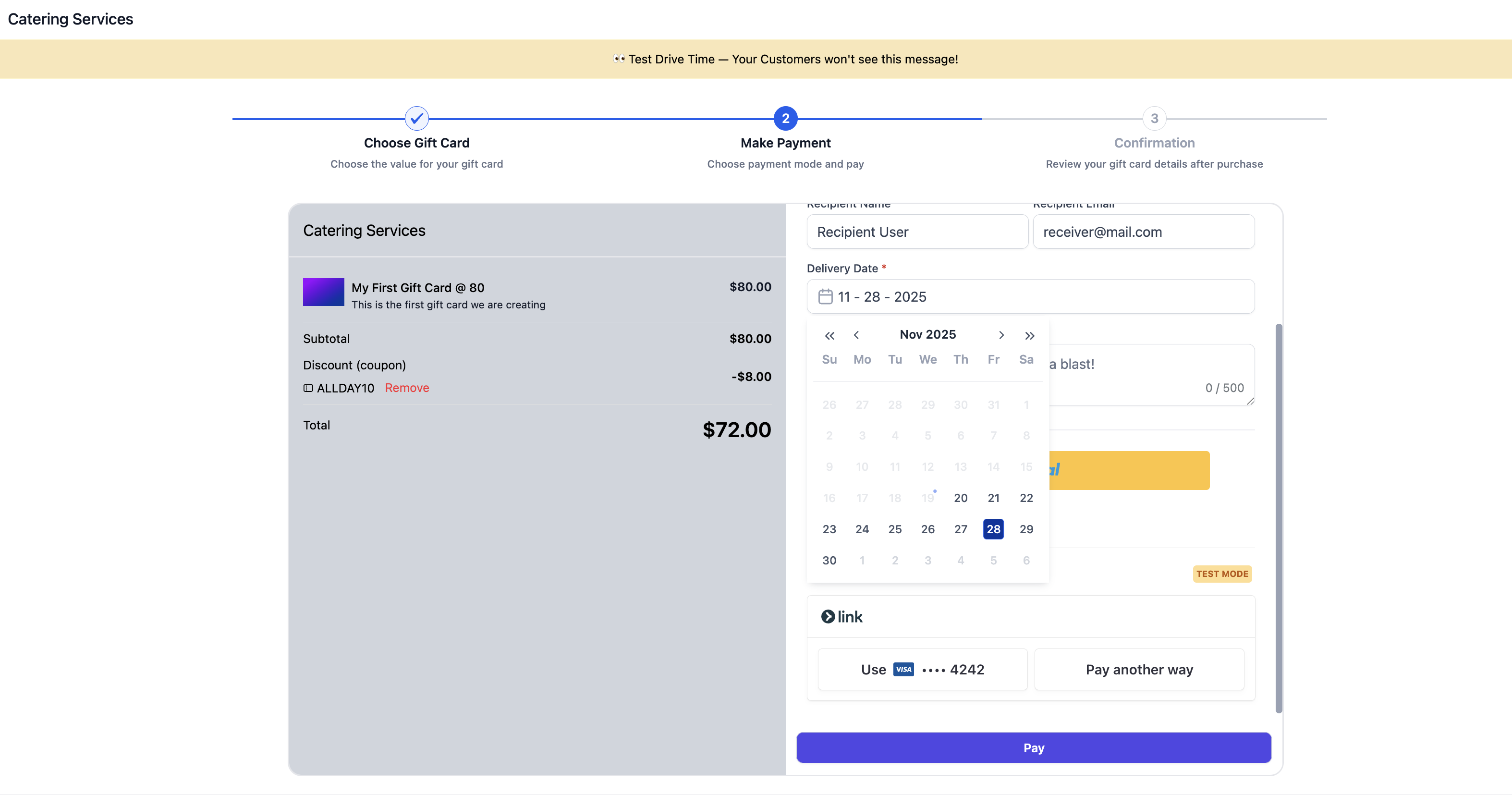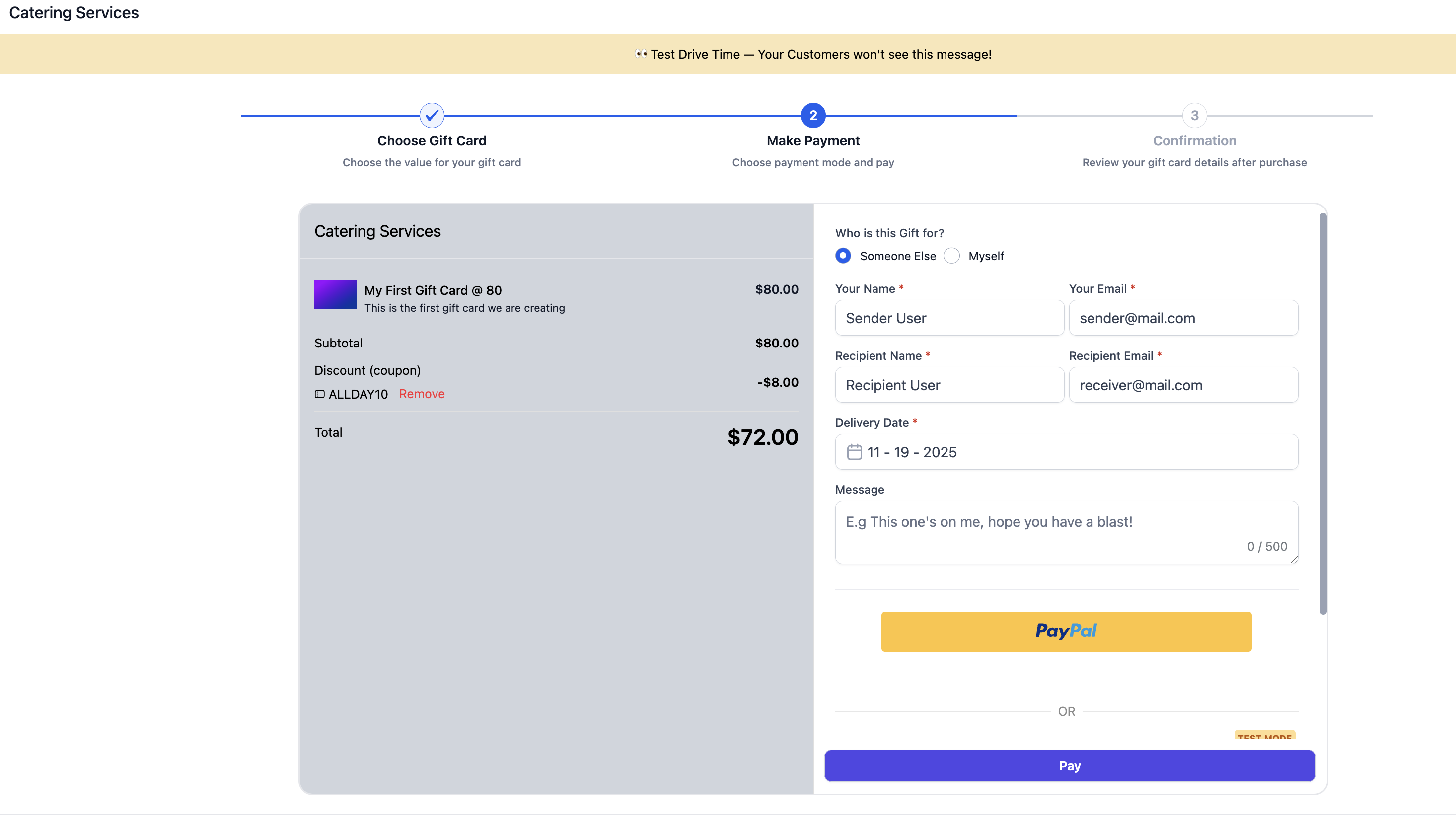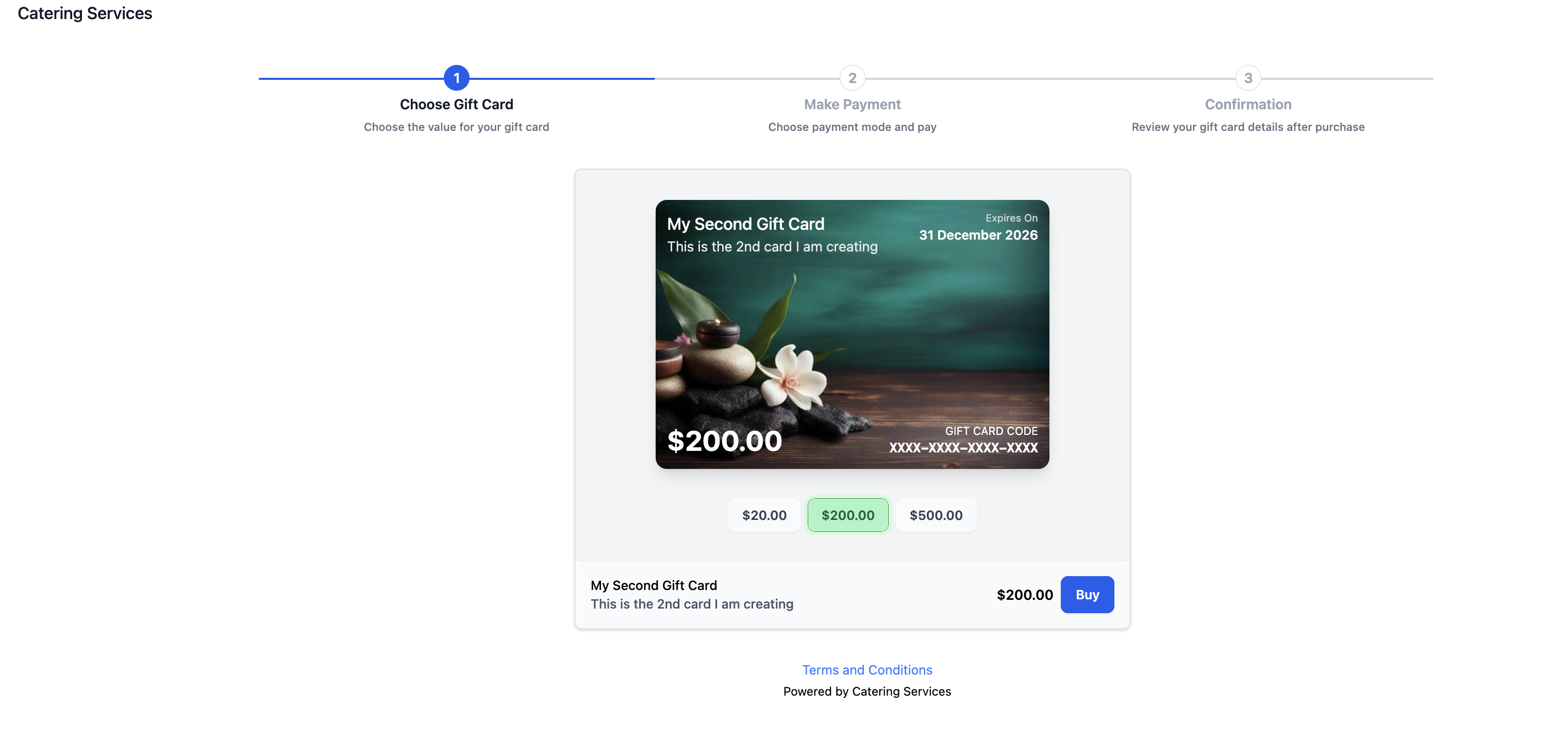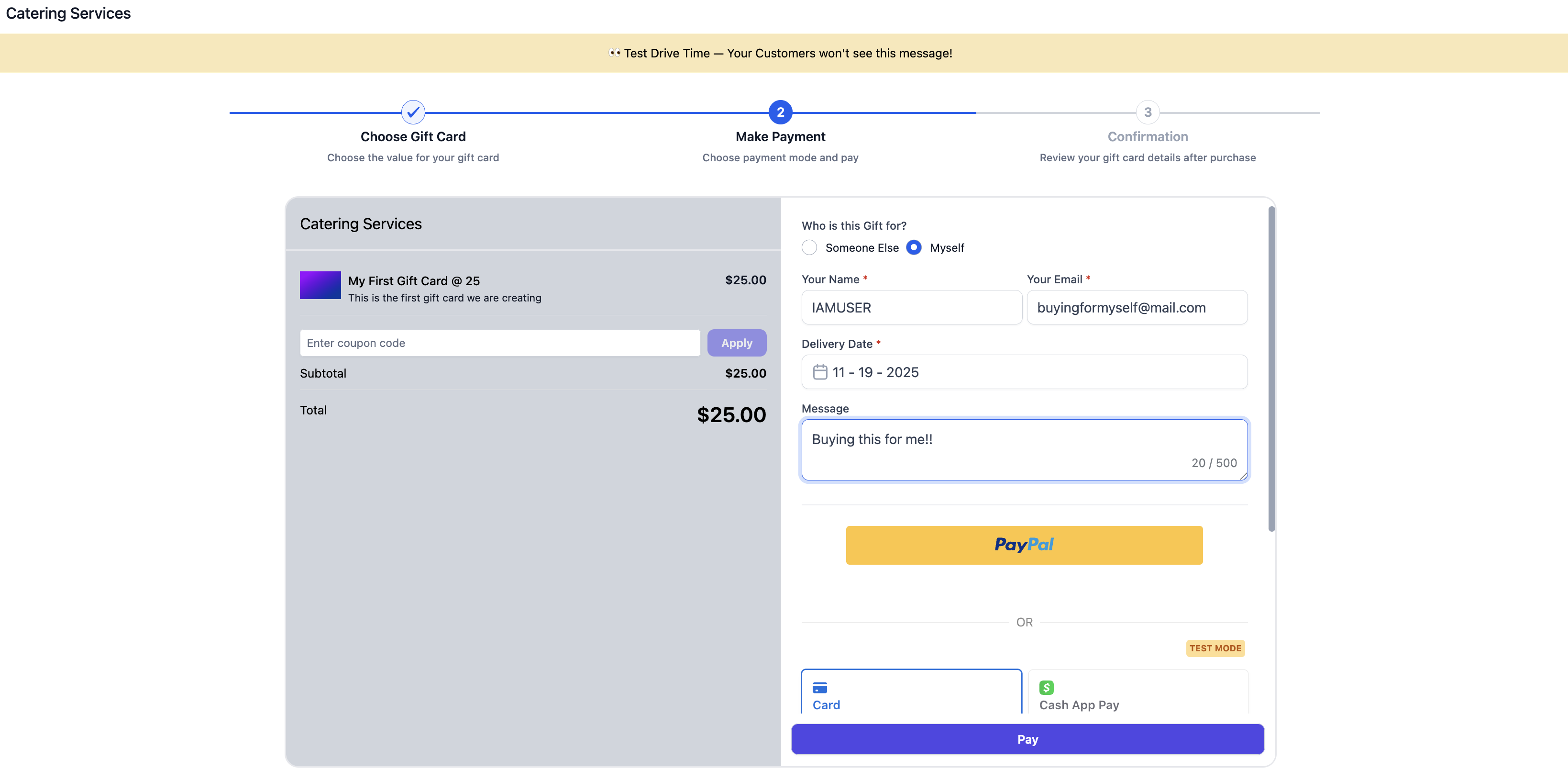 Once the customer lands on the screen (Test or Live), they'll see a 3 step process to purchase gift cards.