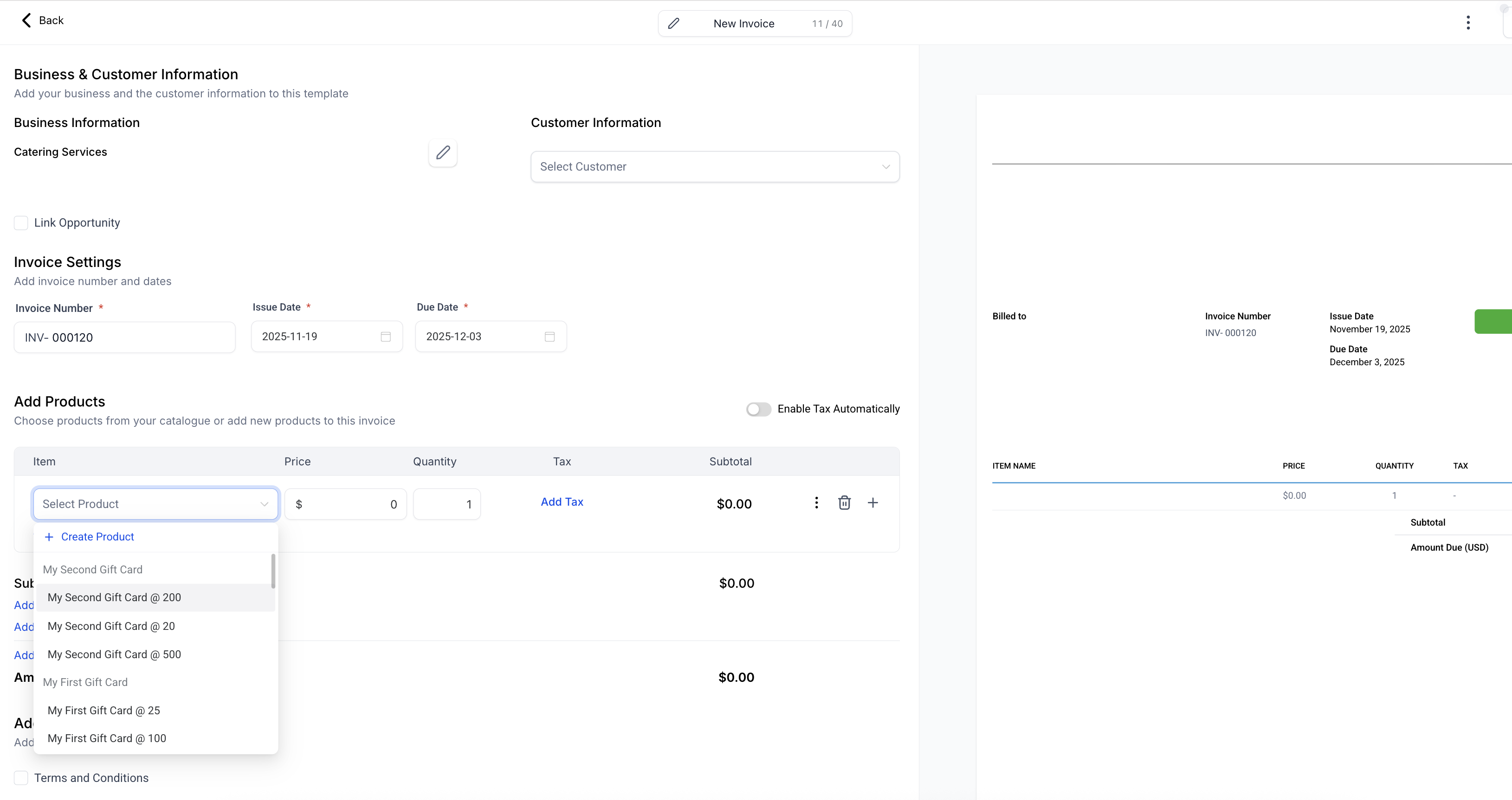(Payments → Gift Cards → Gift Card Products → Create Gift Card)Inventory set (optional)