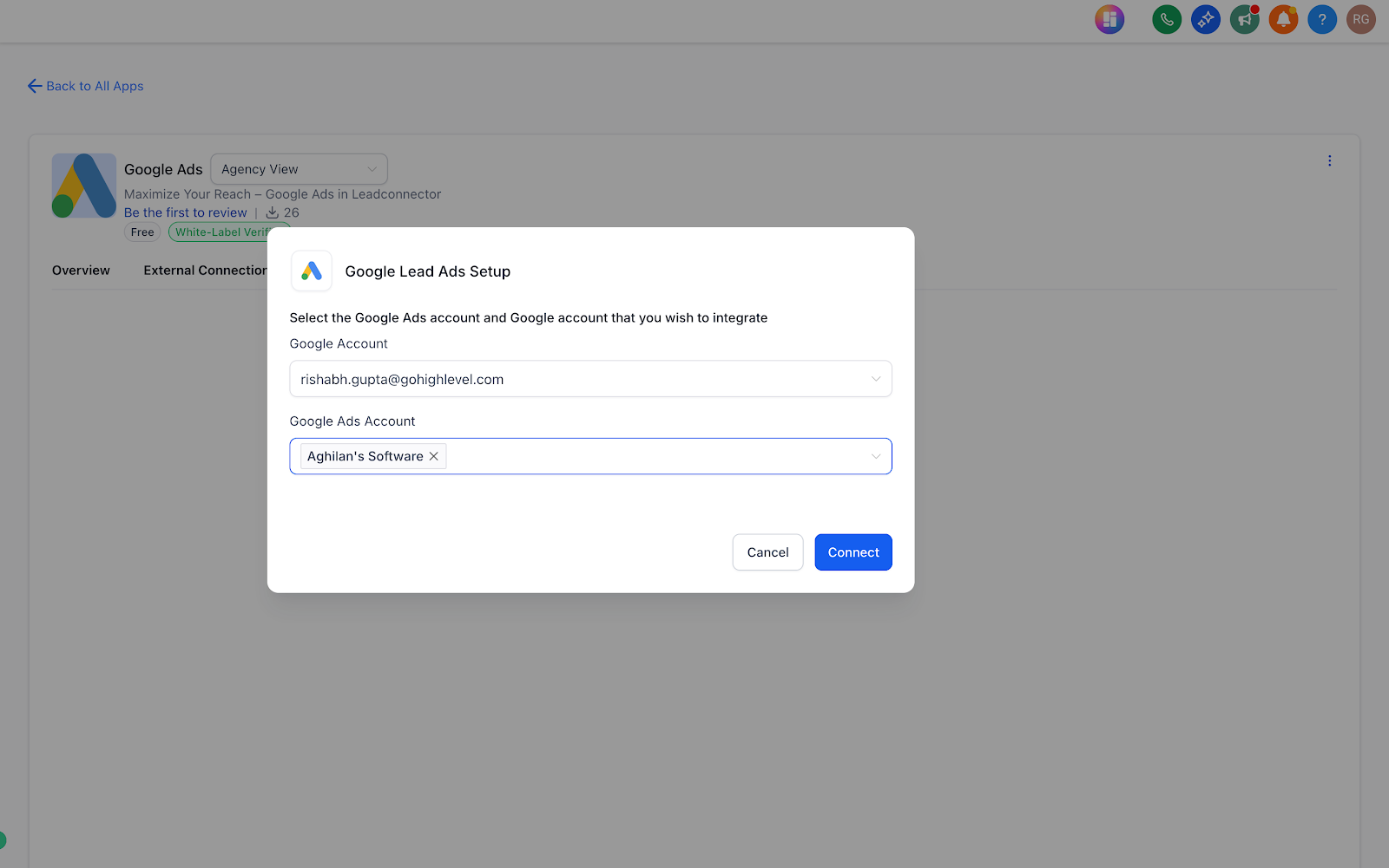 After authentication, select the Google Ads accounts you want to connect for lead syncing.