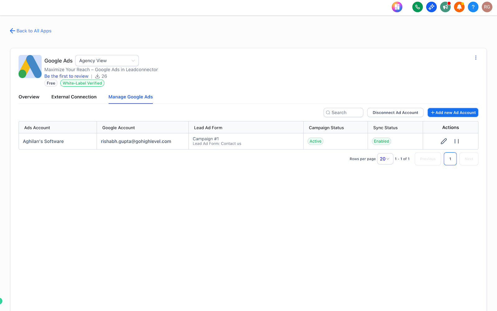 Step 4: Once connected, all lead forms linked to your selected ad accounts will appear — along with their associated campaign names and status.