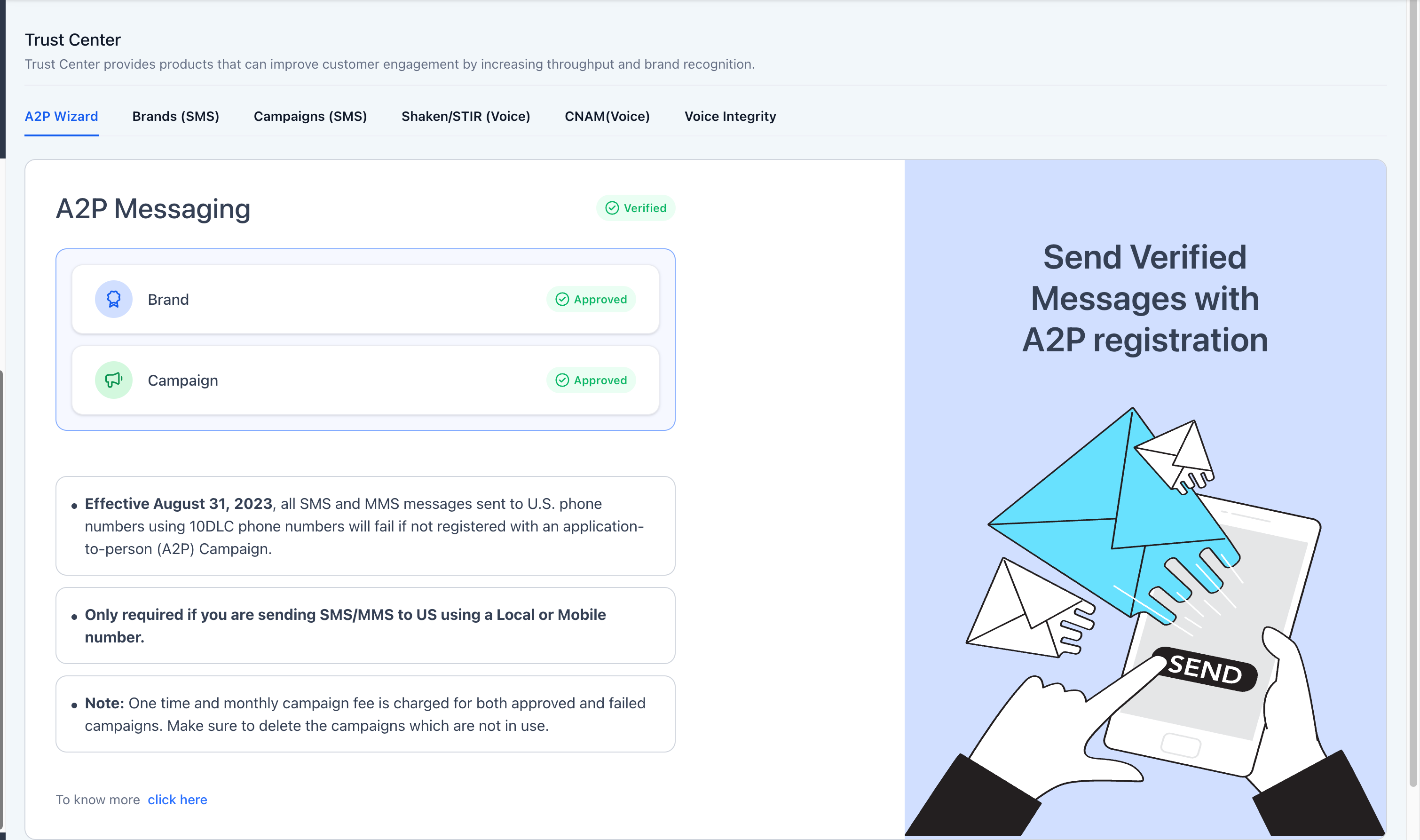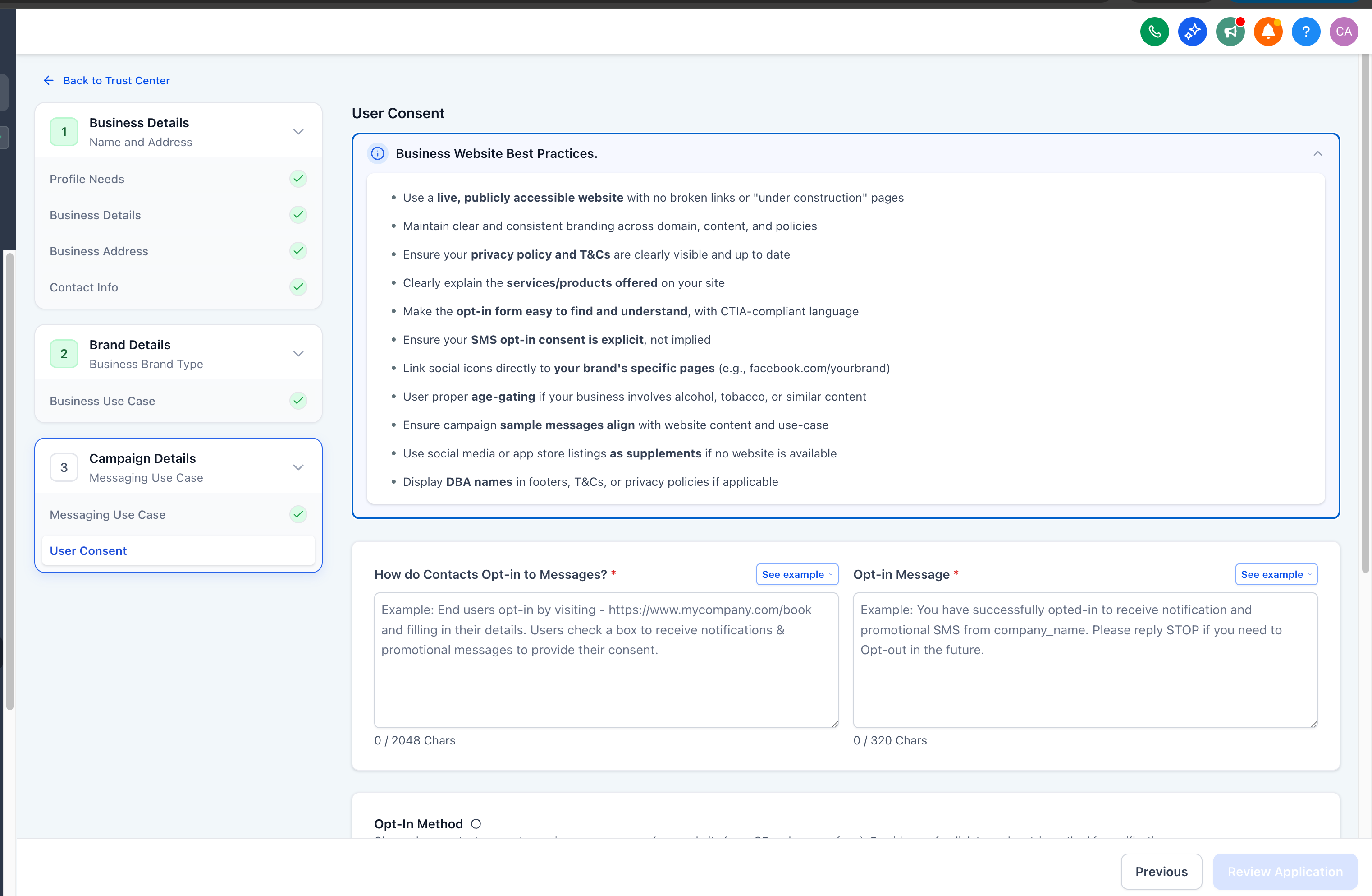 The updated Trust Center introduces a cleaner, guided experience for A2P 10DLC registration—reducing errors, improving clarity, and helping teams submit compliant brand and campaign data with confidence. This article outlines what changed, why it matters, and how the new flow compares to the previous experience. Use it as a practical reference while preparing brands and campaigns for approval.