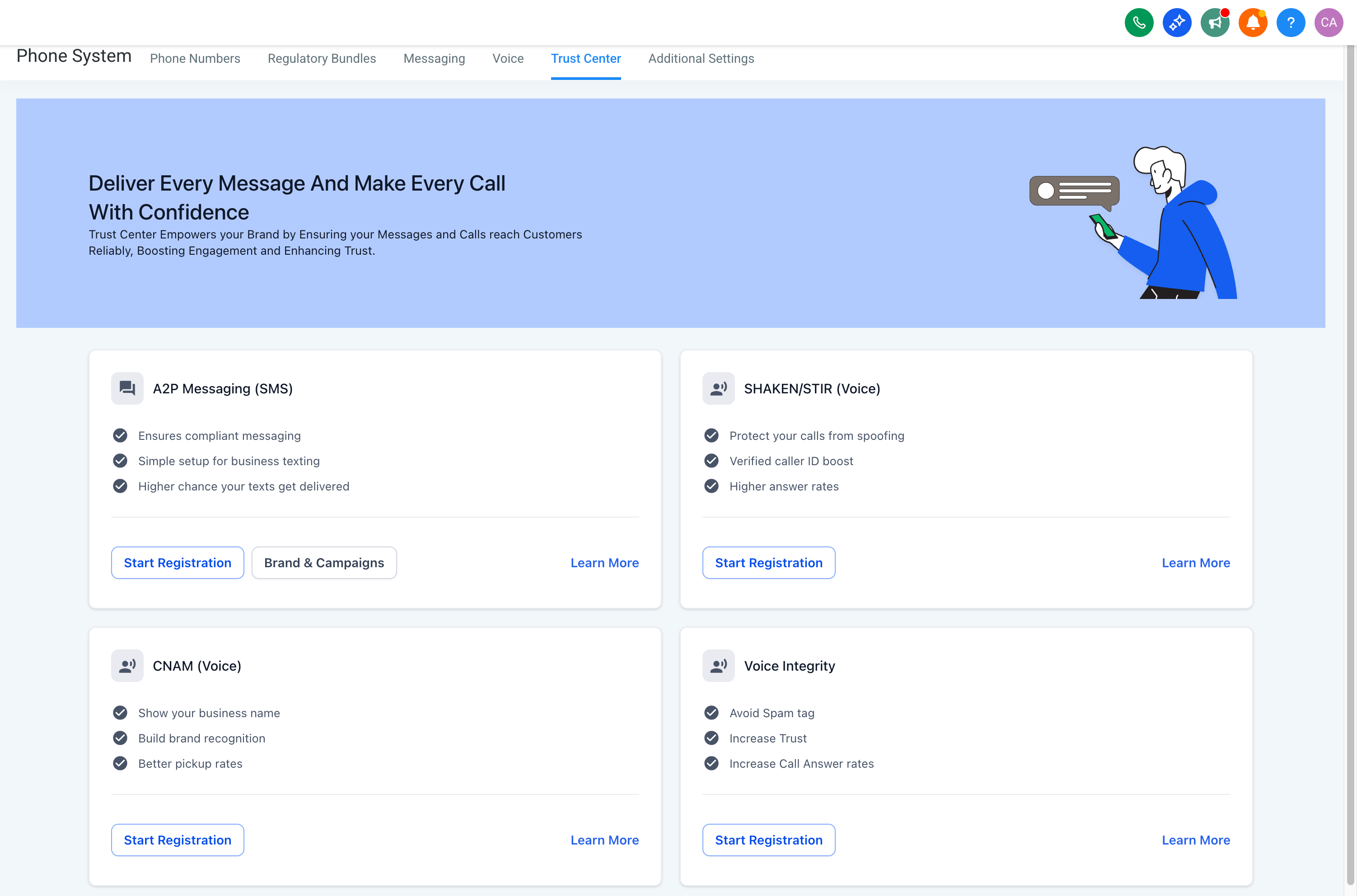 - Now: The redesigned Trust Center introduces a modern, unified interface that visually groups all trust products in one clear, well-structured view. Each product card now highlights its core value proposition (e.g., compliance, verification, or caller trust) with crisp descriptions, actionable “Start Registration” buttons, and links to detailed resources.