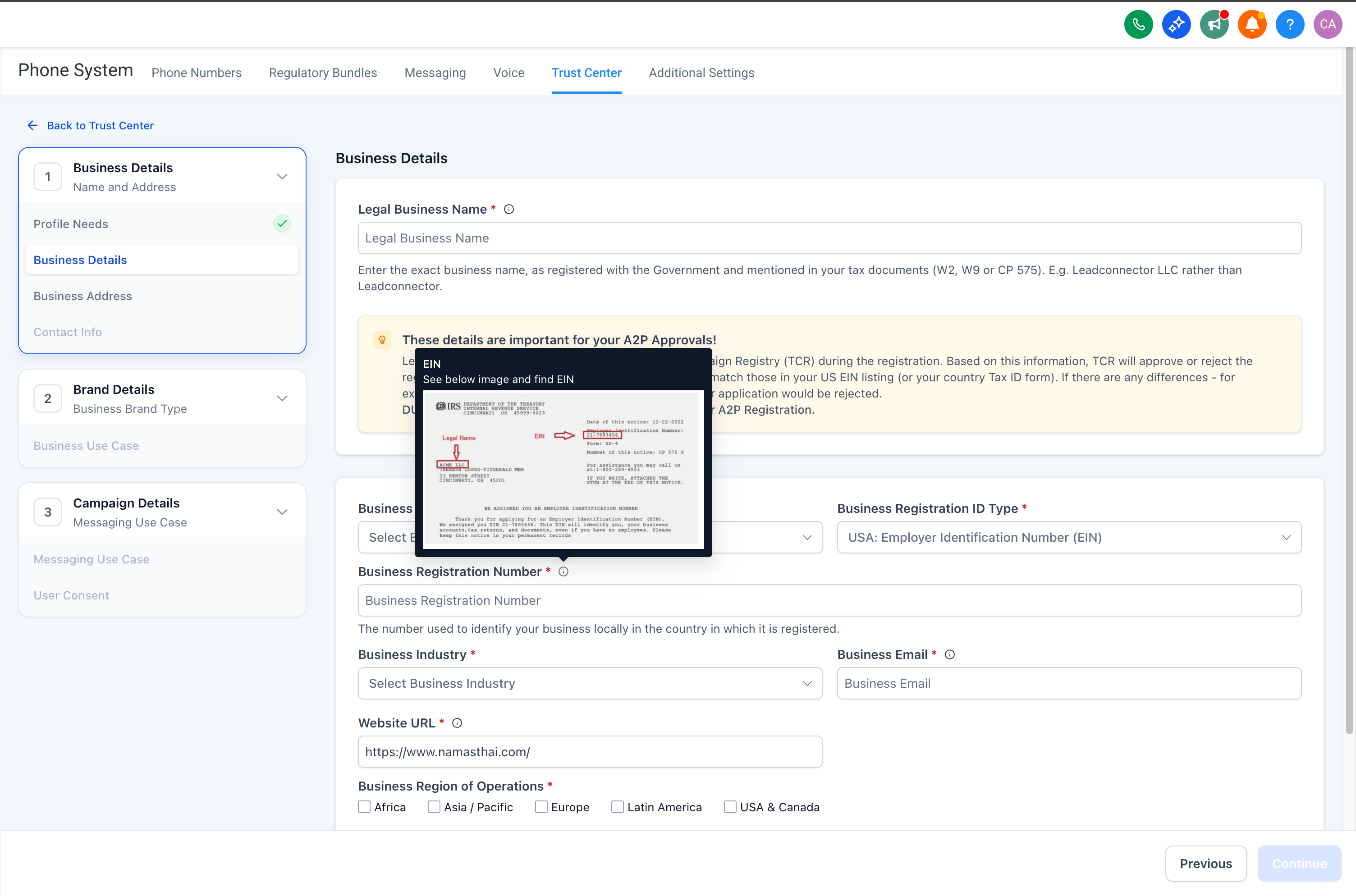 Open the Trust Center: Go to Settings → Phone Numbers → Trust Center to begin A2P registration.