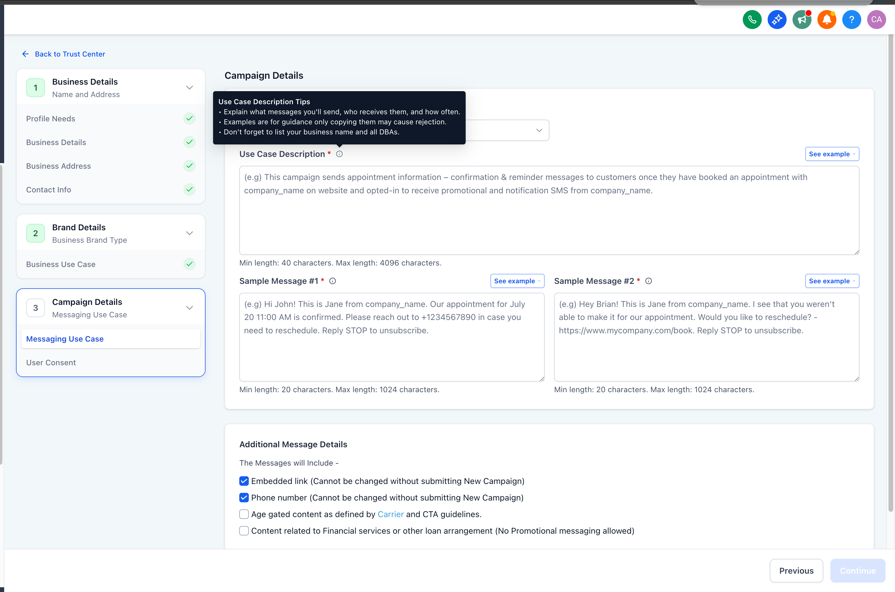 Complete required details with guidance: Fill out Business, Brand, Campaign, and Consent sections. Use the inline tips and examples to format fields correctly and provide clear consent language.