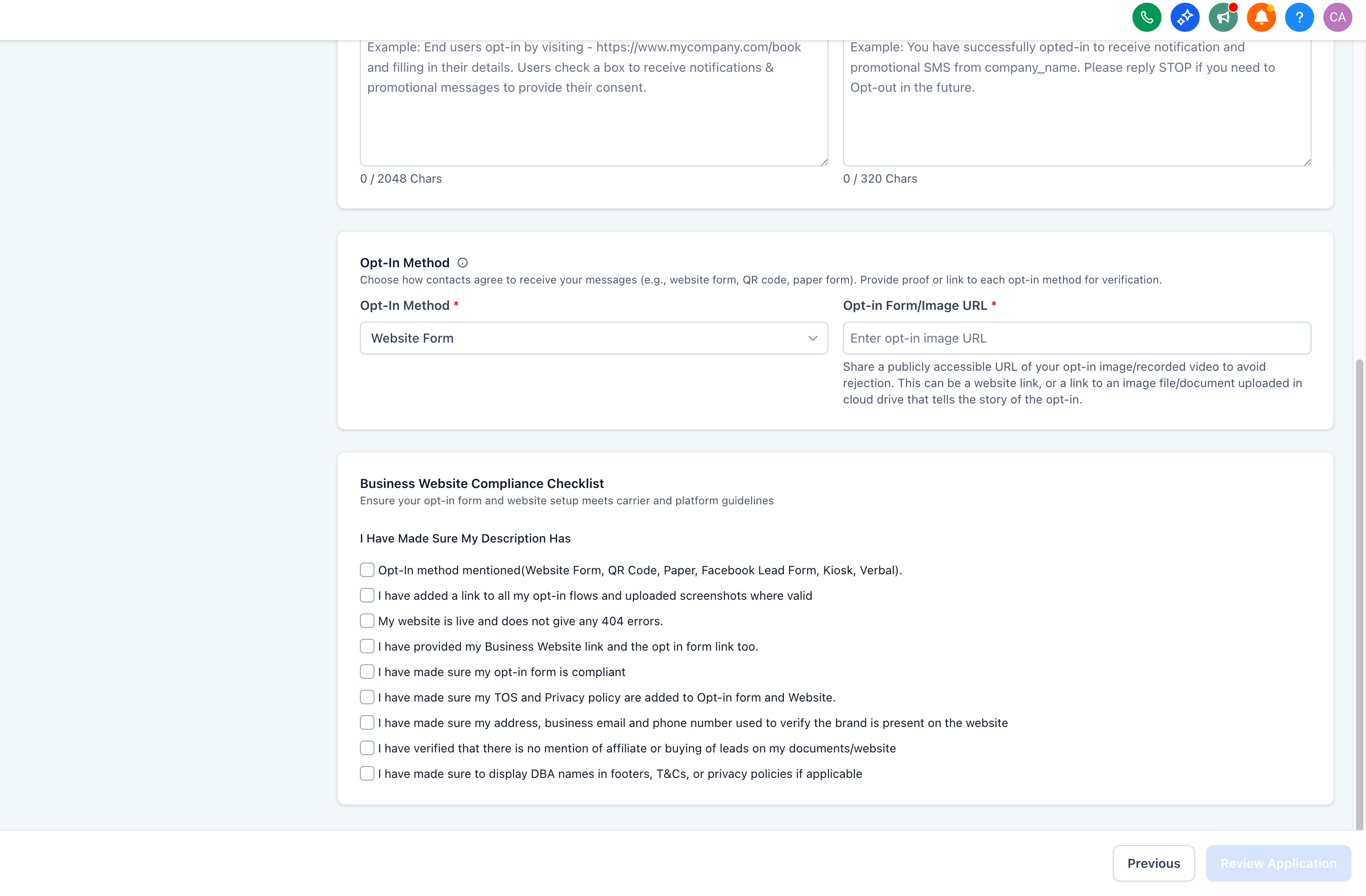 A final, consolidated checklist helps catch inconsistencies—such as incomplete sample messages or missing consent details - before submission, reducing back-and-forth and potential rejections.