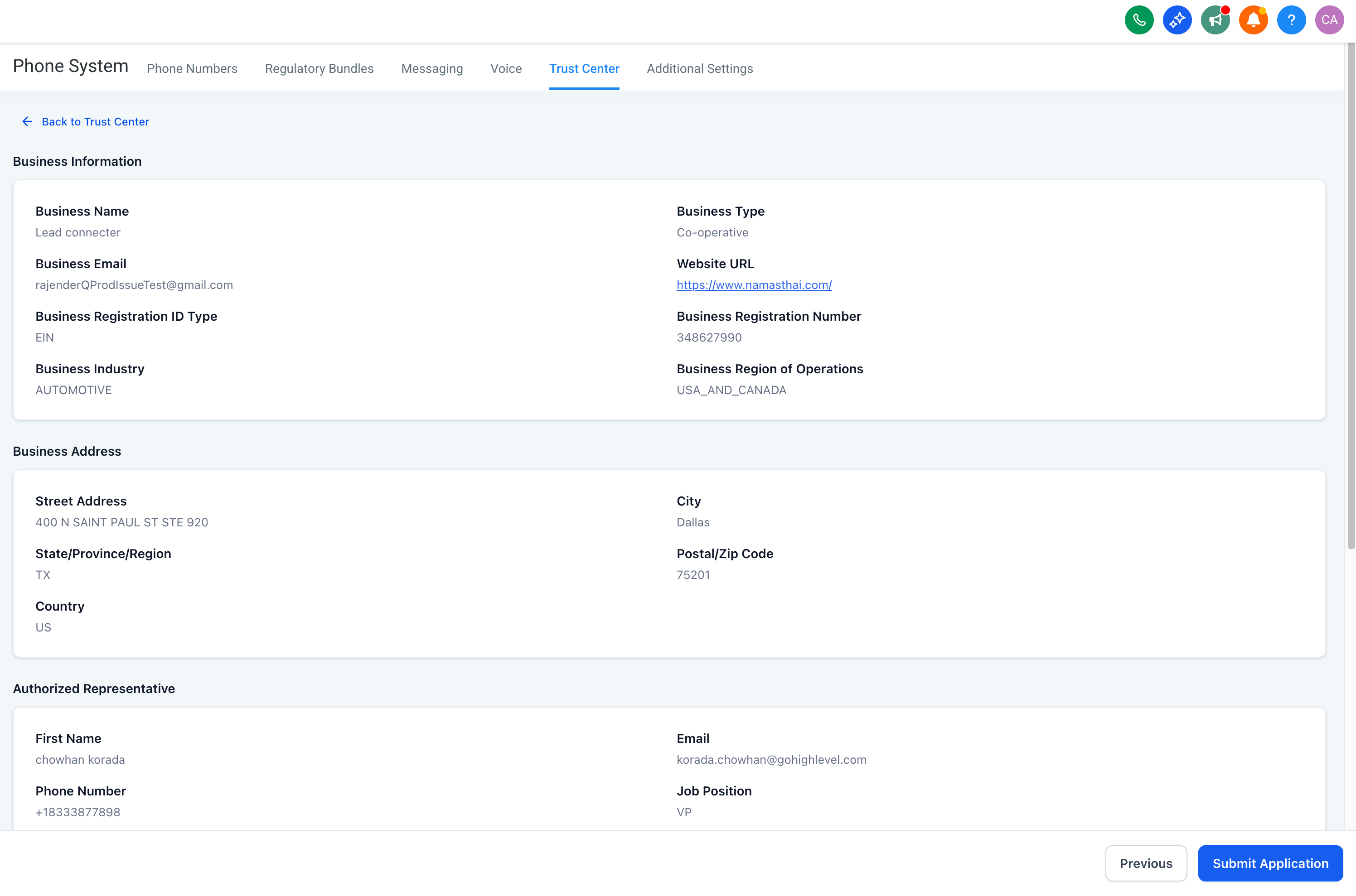 HighLevel’s Trust Center is the in-app workspace for registering U.S./Canadian long-code messaging (A2P 10DLC). The revamp focuses on a modern, step-by-step wizard with clearer guidance, smarter field checks, and a final Submission Review to validate details before sending—designed to reduce rework and improve submission quality.
