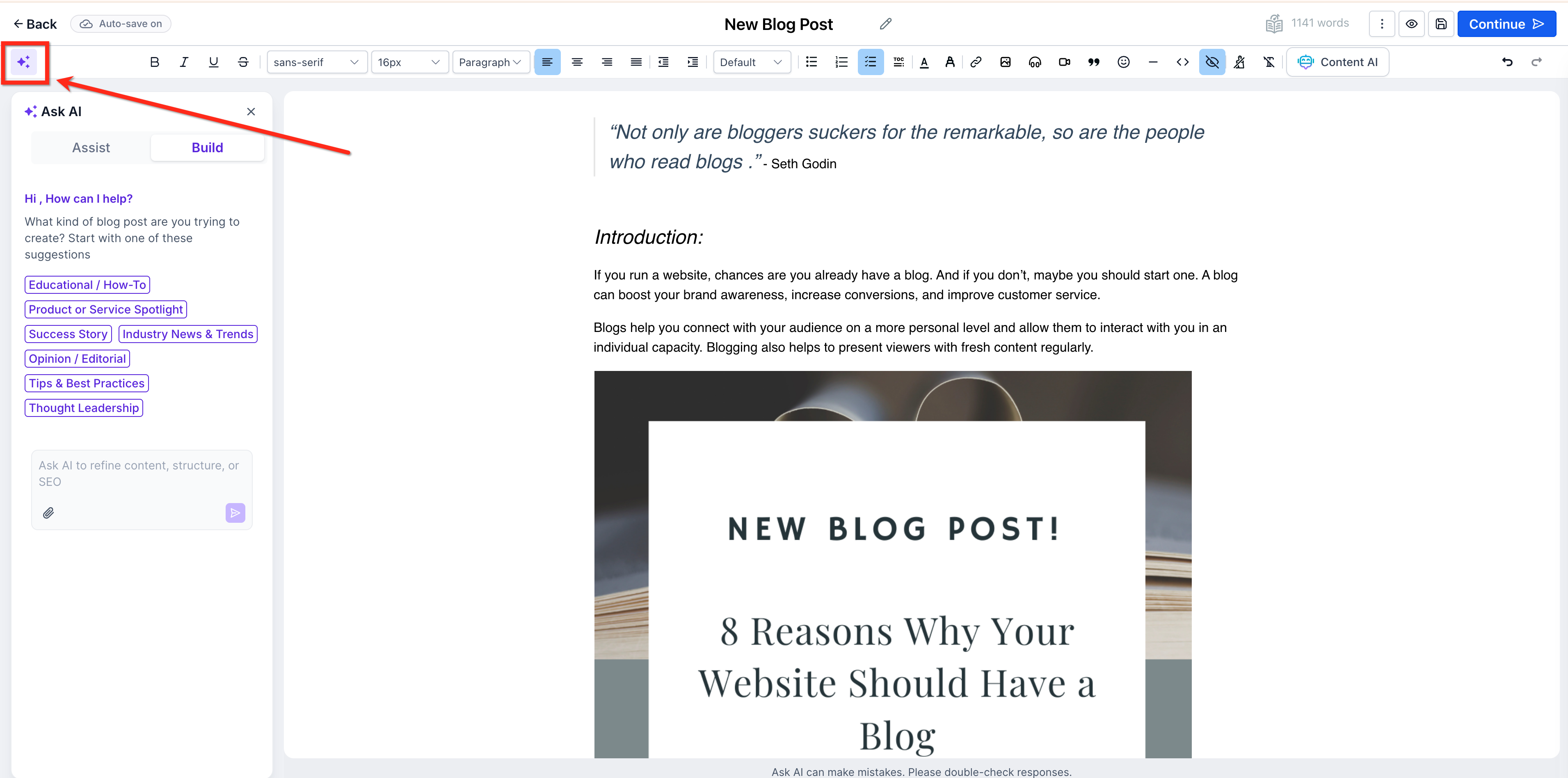 In the Blog Editor, open the Ask AI panel.