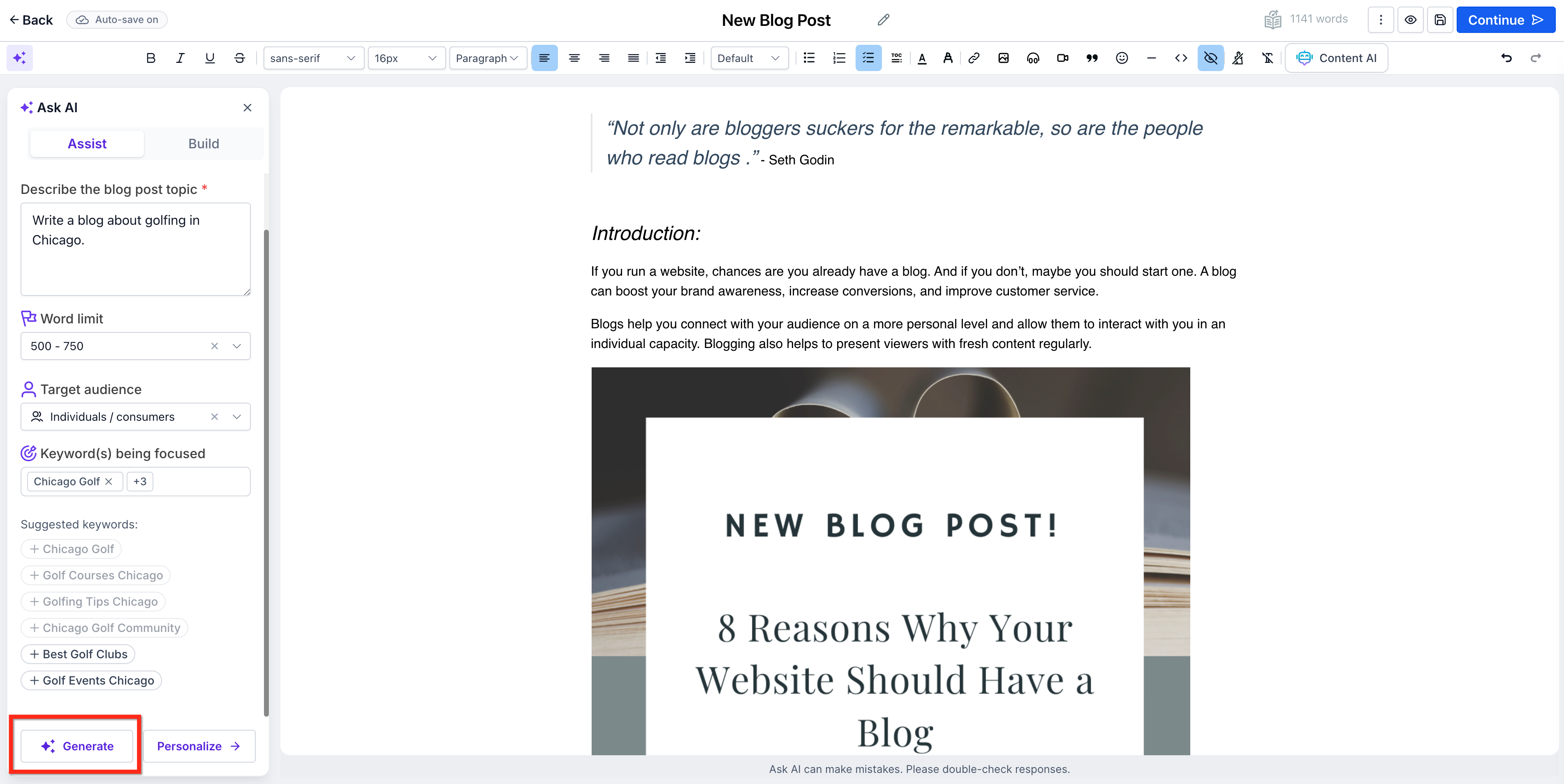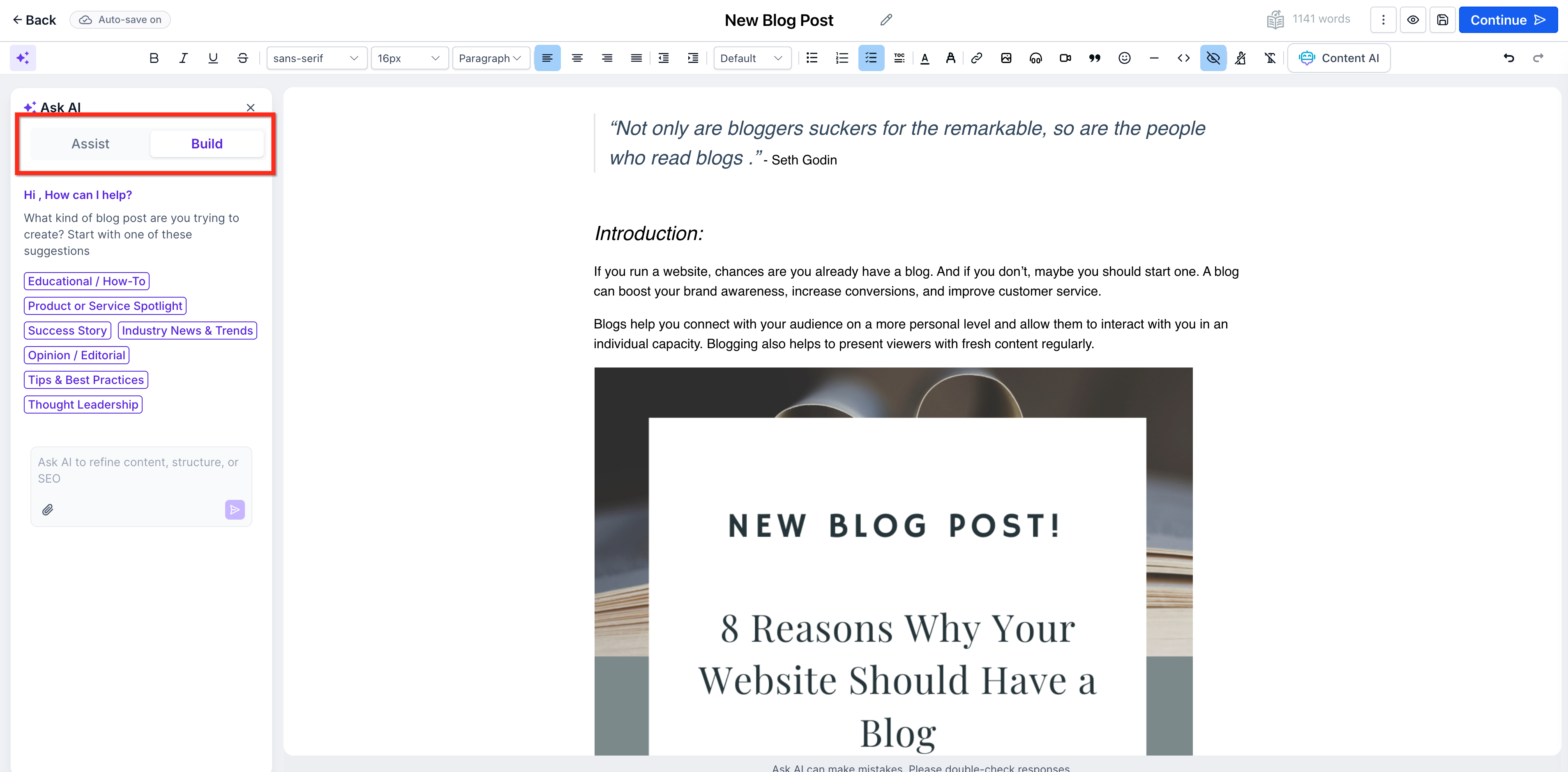 To use Build Mode, write any custom prompt, such as the example below, and the AI will create a tailored blog: