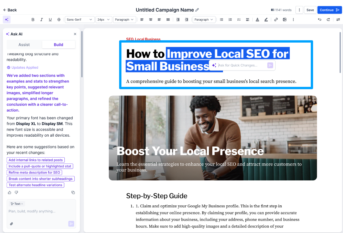 Assist Mode generates a complete blog from a simple topic input. Build Mode gives you more control using custom prompts for specific or branded content
