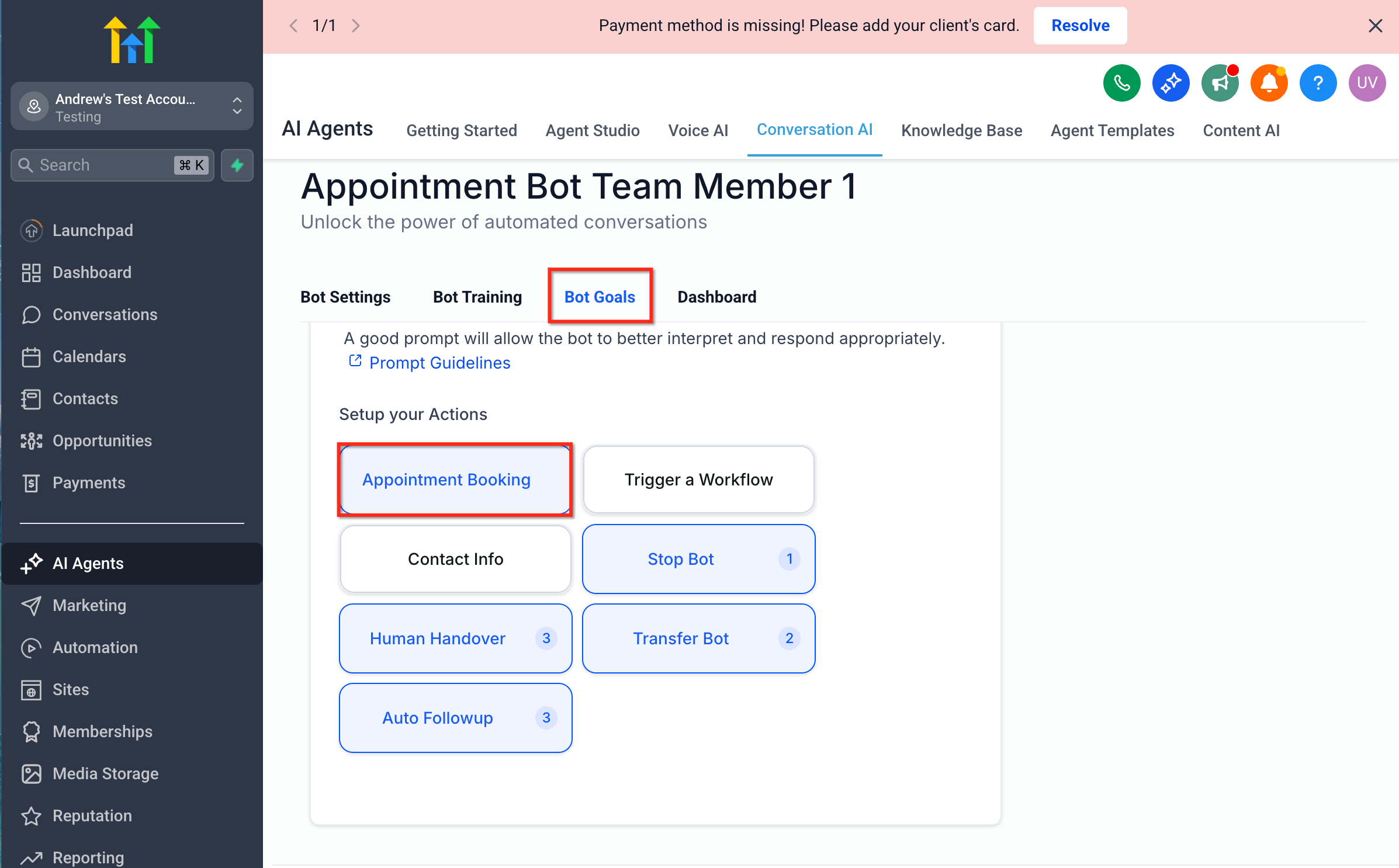 - Click on the agent added and navigate to the Bot Goals section and start completing the appointment booking settings.