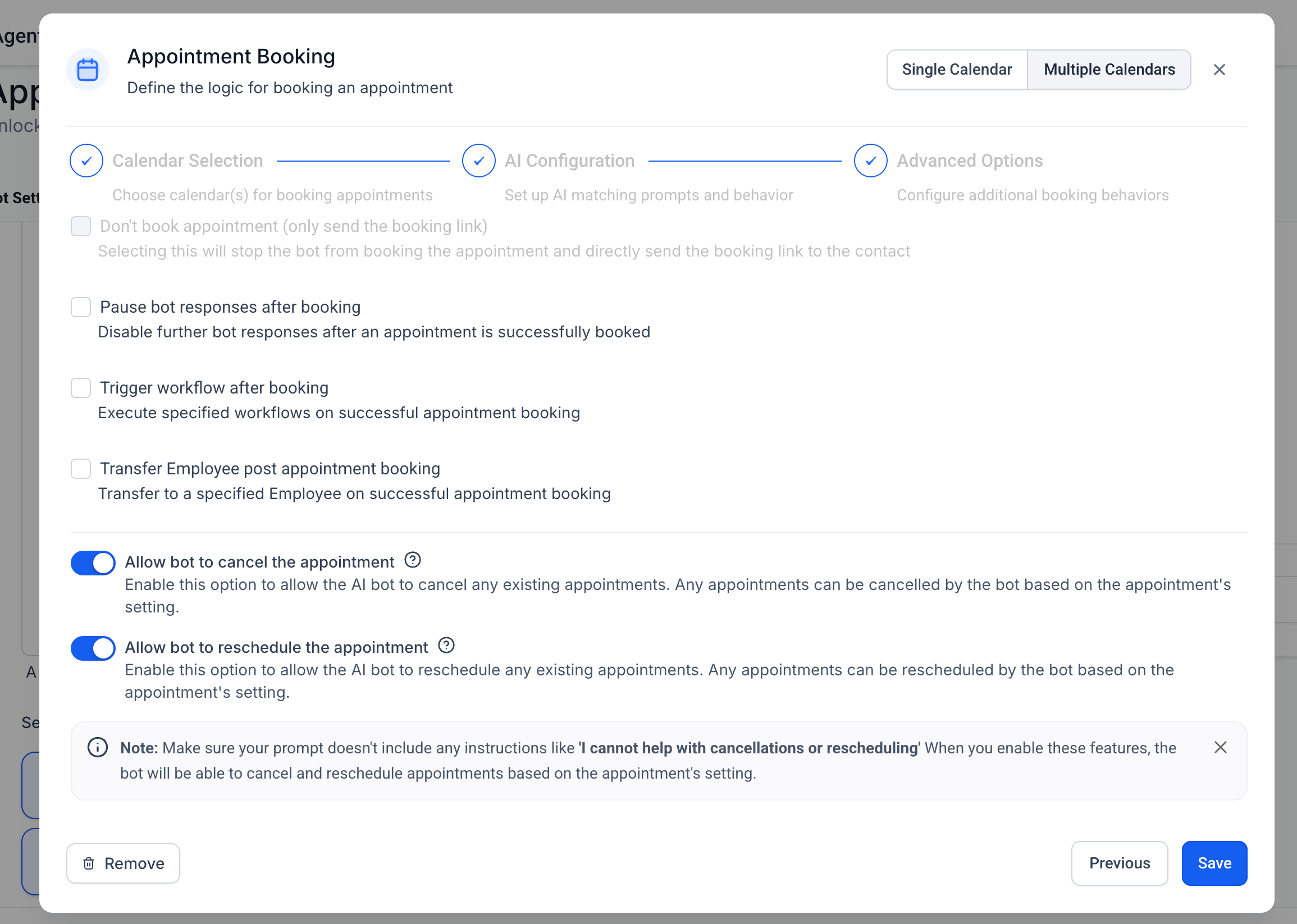 AI can generate clear calendar descriptions and suggested trigger phrases so the system better understands when to use each calendar. You can accept, refine, or replace these to suit your brand and services.