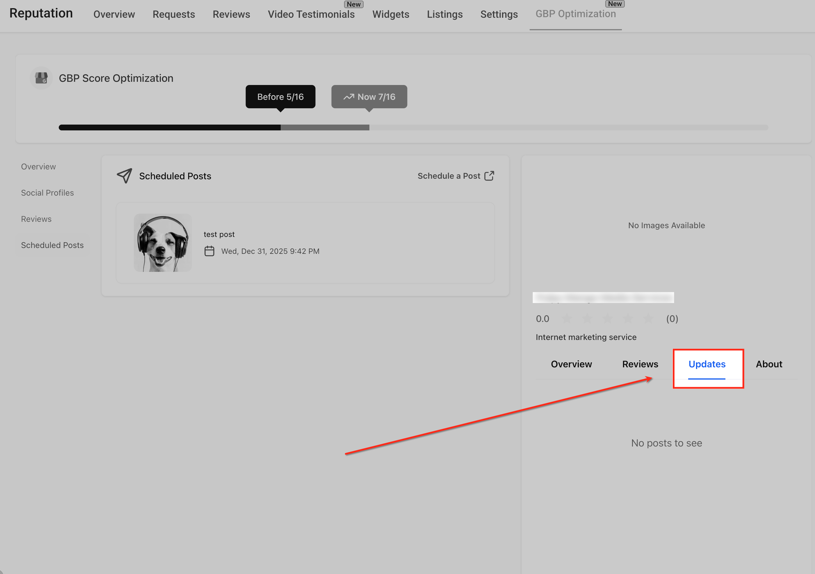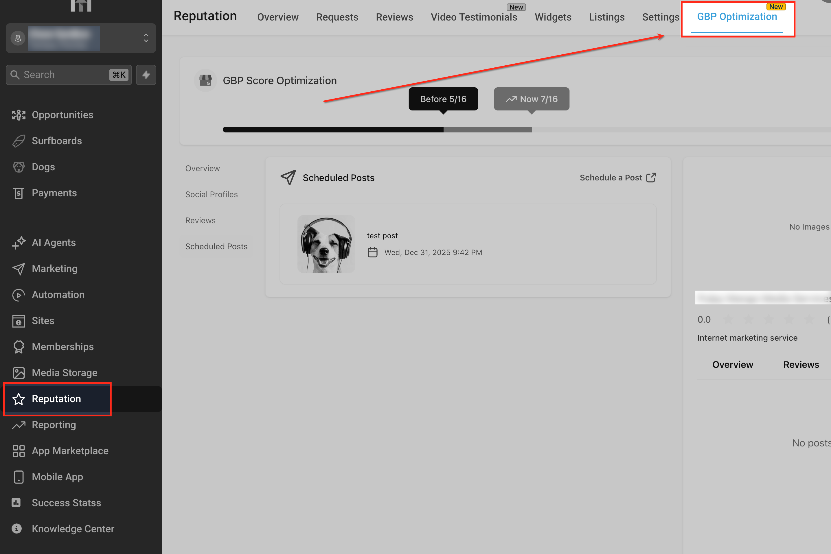 From the left-hand menu, click Reputation, then select GBP Optimization at the top to view all Google Business Profile–related tools, including Scheduled Posts.