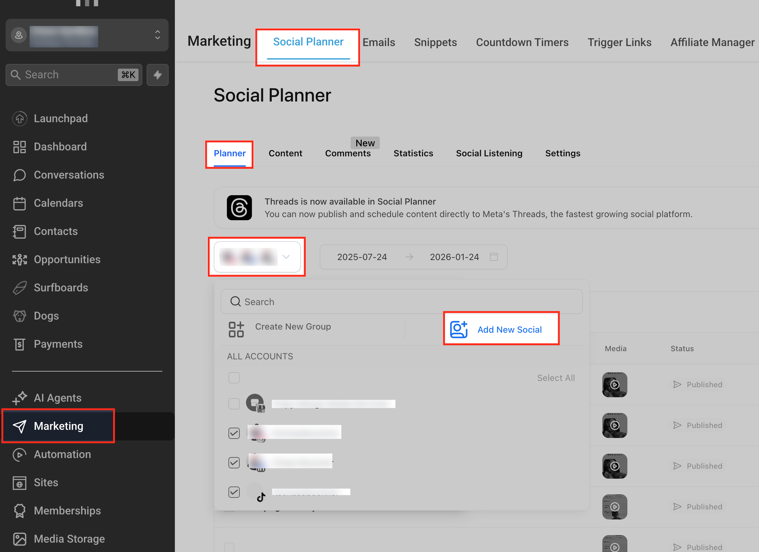 Navigate to Marketing in the left-hand menu, then select Social Planner and make sure the Planner tab is active at the top. From there, use the account dropdown to choose the correct sub-account and click Add New Social to begin connecting a Google Business Profile.