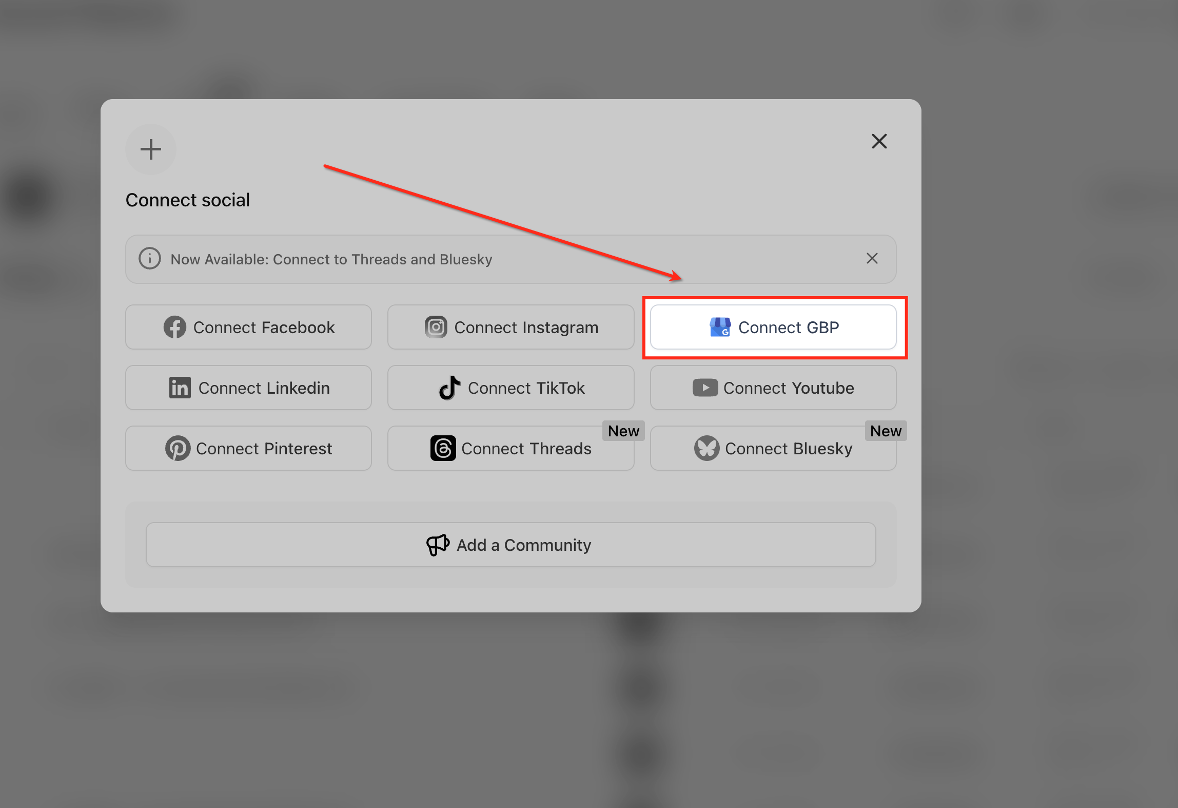 Select Connect GBP from the list of available social platforms to begin linking a Google Business Profile. This option starts the Google authorization flow, allowing HighLevel to securely access and manage posts for the selected business location.