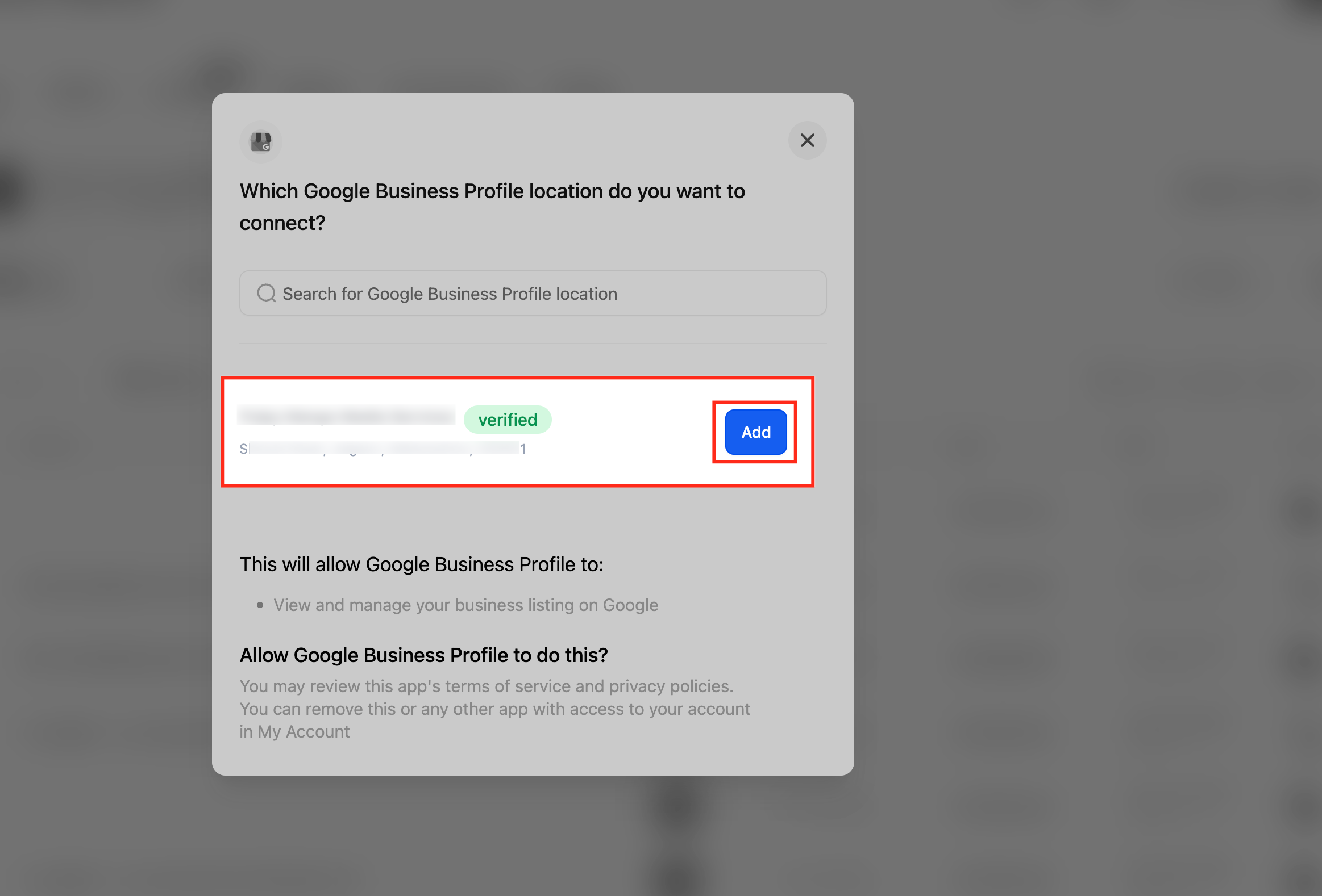 After clicking Connect GBP, you’re prompted to choose the Google account you want to use, and HighLevel automatically fetches all Google Business Profiles associated with that account. Select the correct location from the list and click Add to connect it, enabling HighLevel to manage and schedule posts for that business.