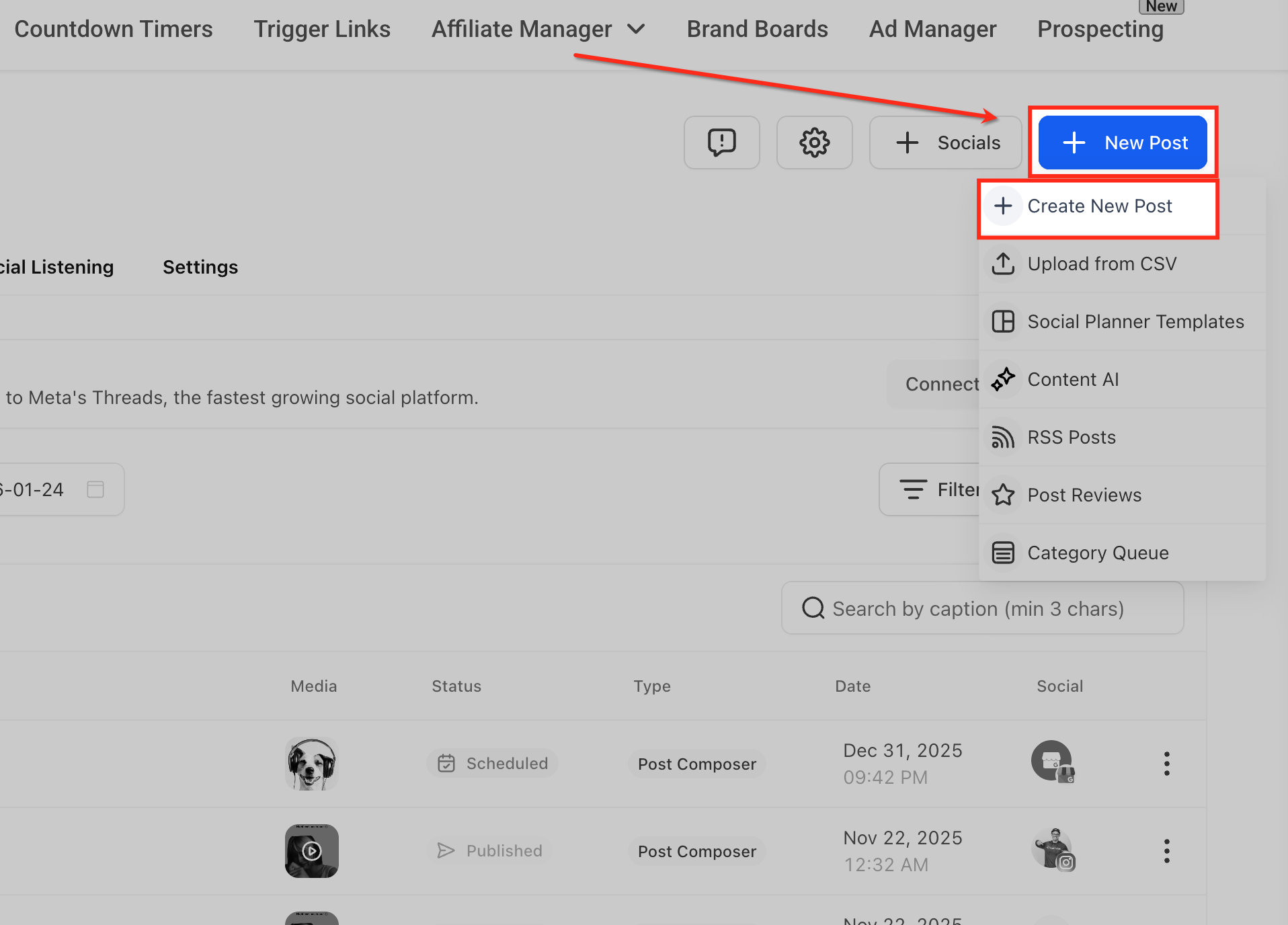 Click New Post in the top-right corner and select Create New Post to open the post composer in Social Planner. This is the starting point for creating a Google Business Profile post, where you’ll add content, select profiles, and configure scheduling options.