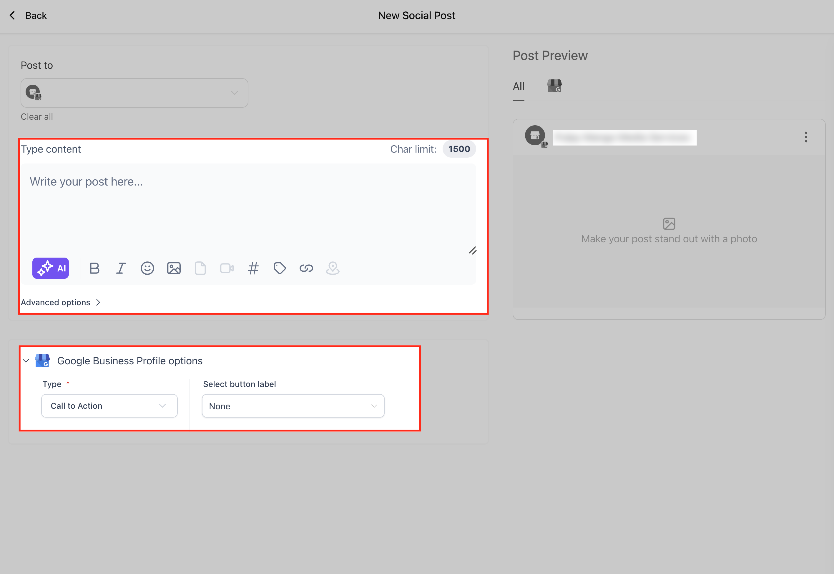 Enter your message in the content editor, keeping the 1,500-character limit in mind, and use the formatting tools to enhance readability, such as bold text, emojis, hashtags, and links. You can also click AI to generate optimized copy, add an image to make the post more engaging, and use the Google Business Profile options below to choose the post type (Update, Offer, or Event) and optionally add a call-to-action button.