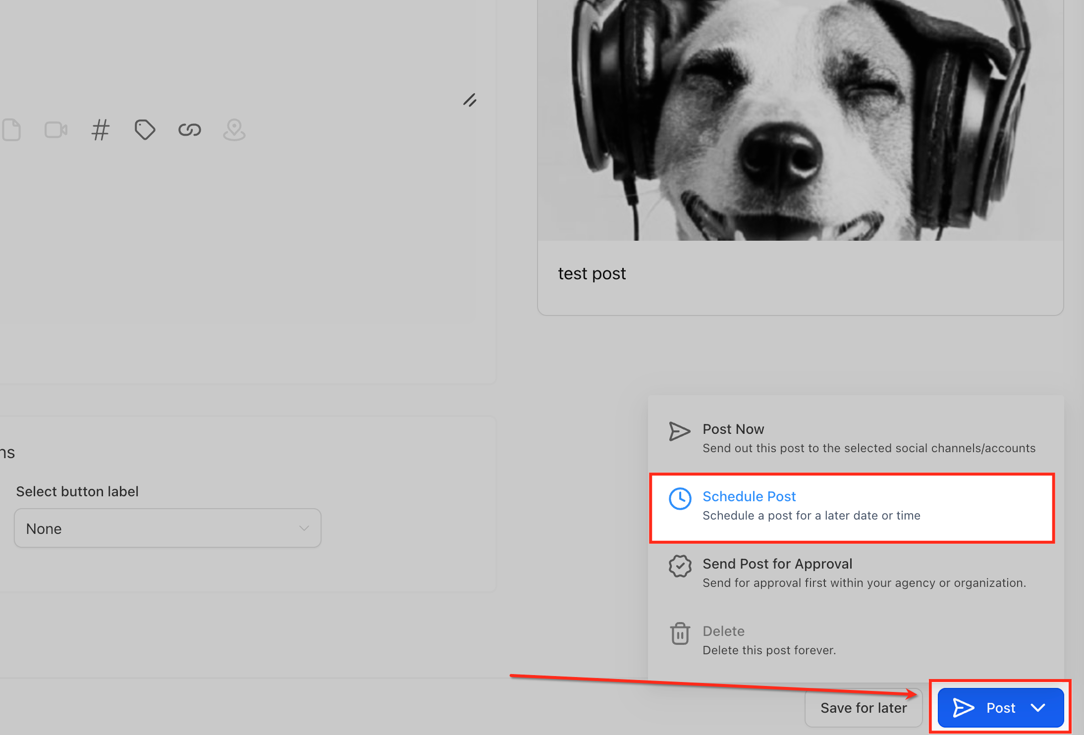 After clicking Post, choose how the GBP post should be handled based on your workflow and timing. Select Schedule Post to publish on a specific date and time, Post Now to publish immediately, or Send Post for Approval if the post needs review before going live, then confirm your selection to complete the process.