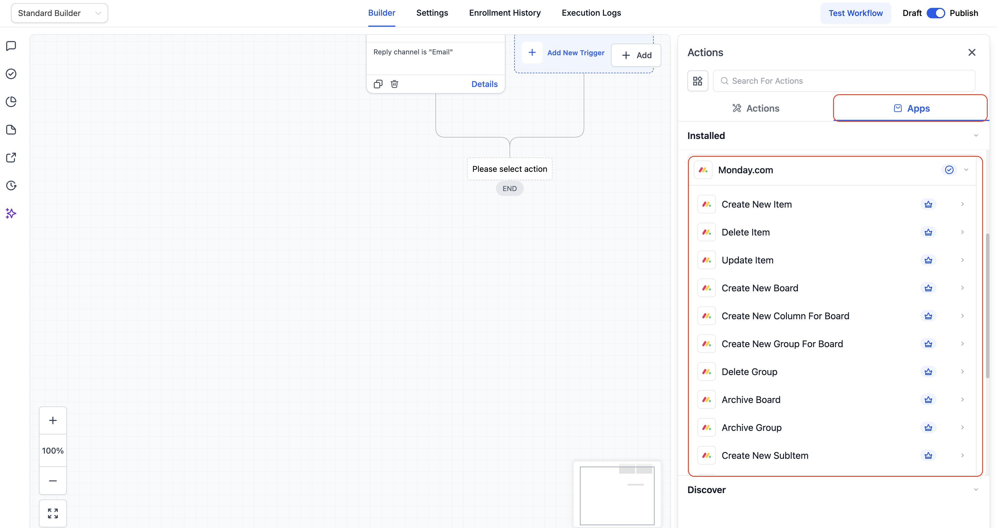 In the Automations Builder, click Add Trigger or Add Action, then search for Monday.com.