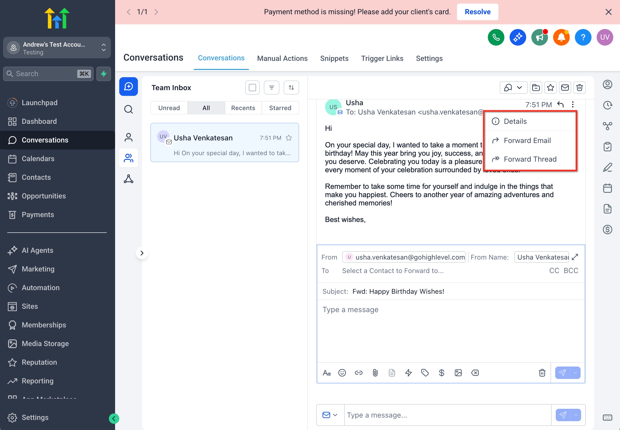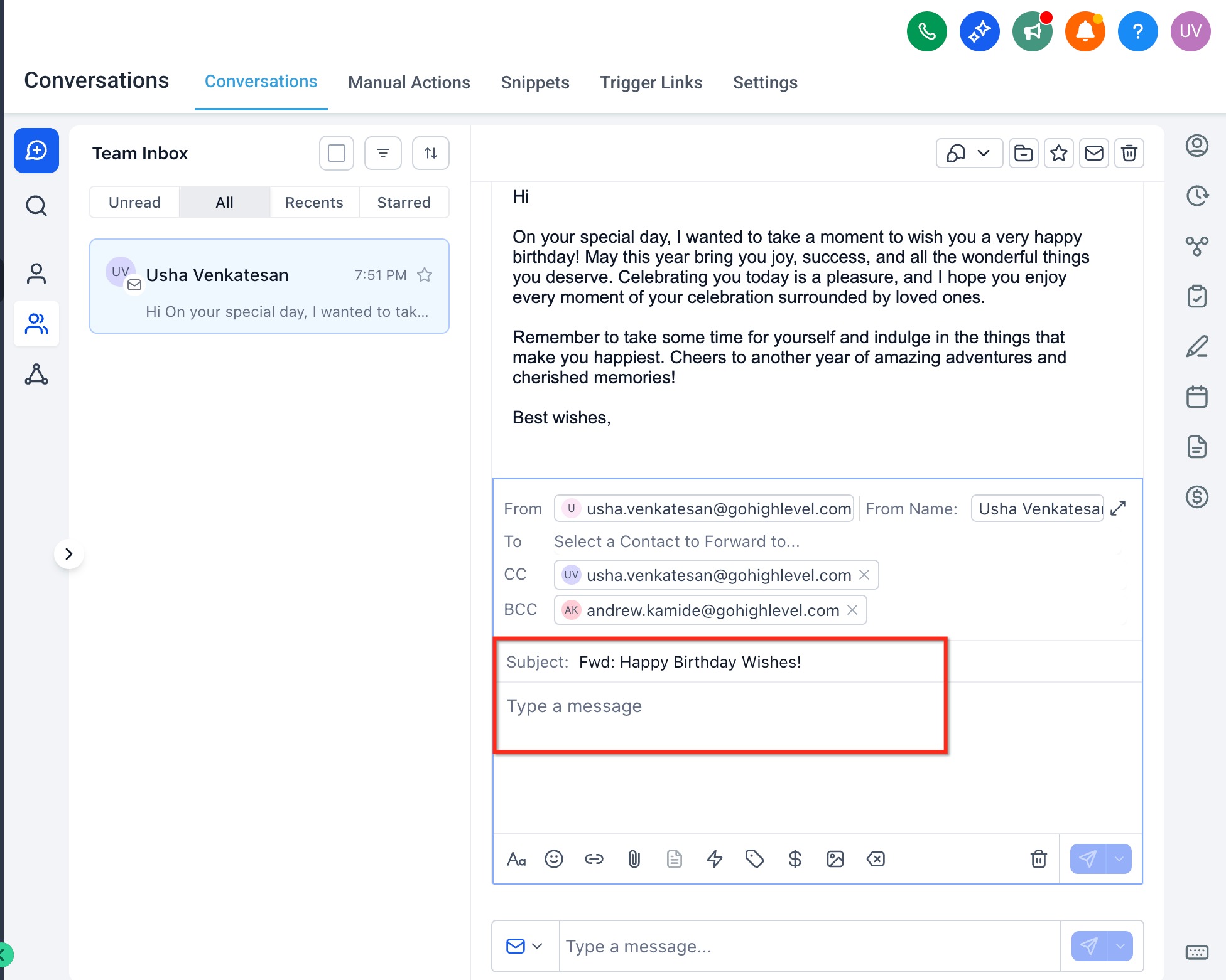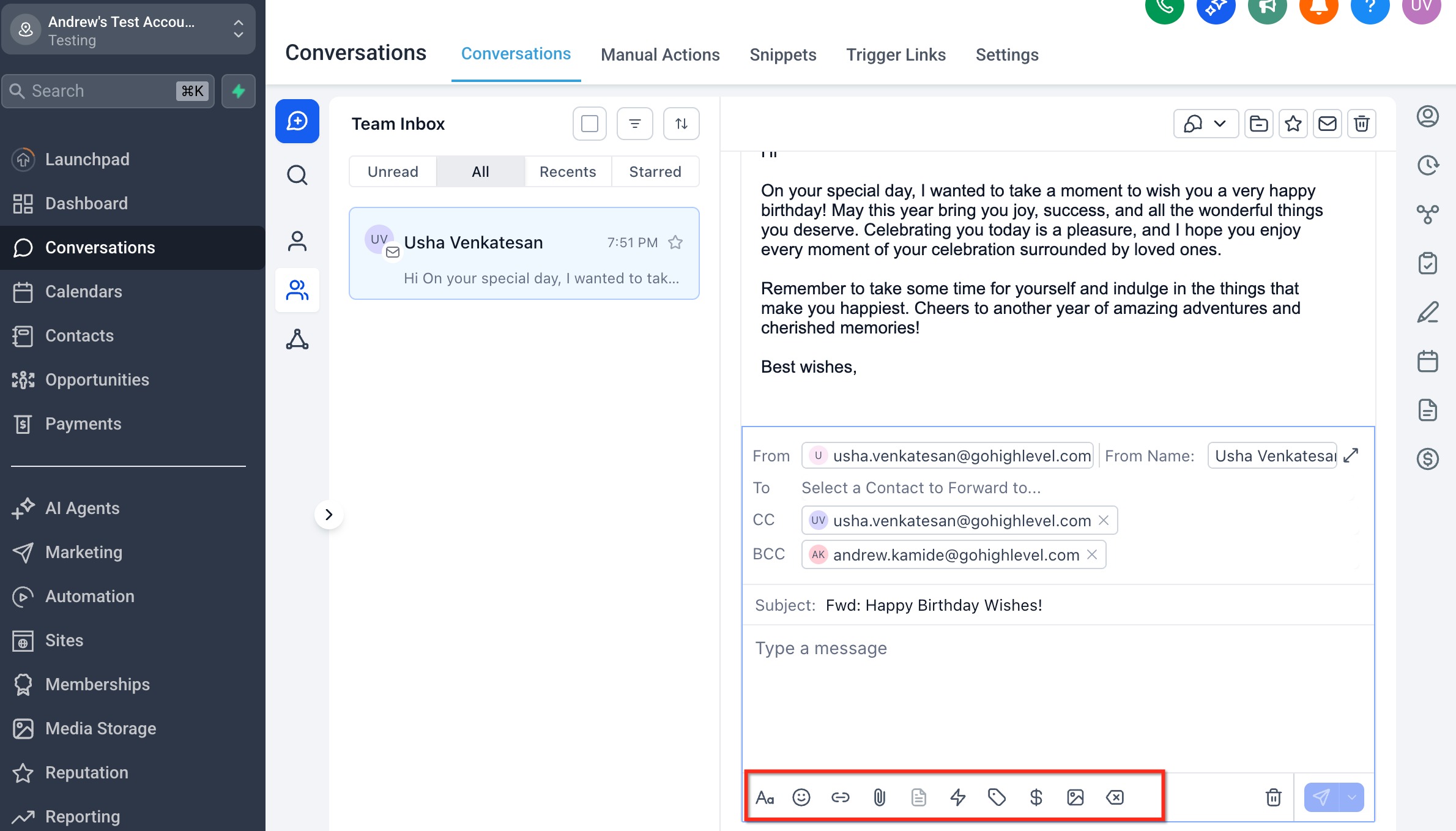Email Forwarding lets an agent take a specific inbound email inside a Conversation and send it to external recipients from within HighLevel. The forwarded message preserves the original email content and formatting so stakeholders outside your account can review context without you switching tools.