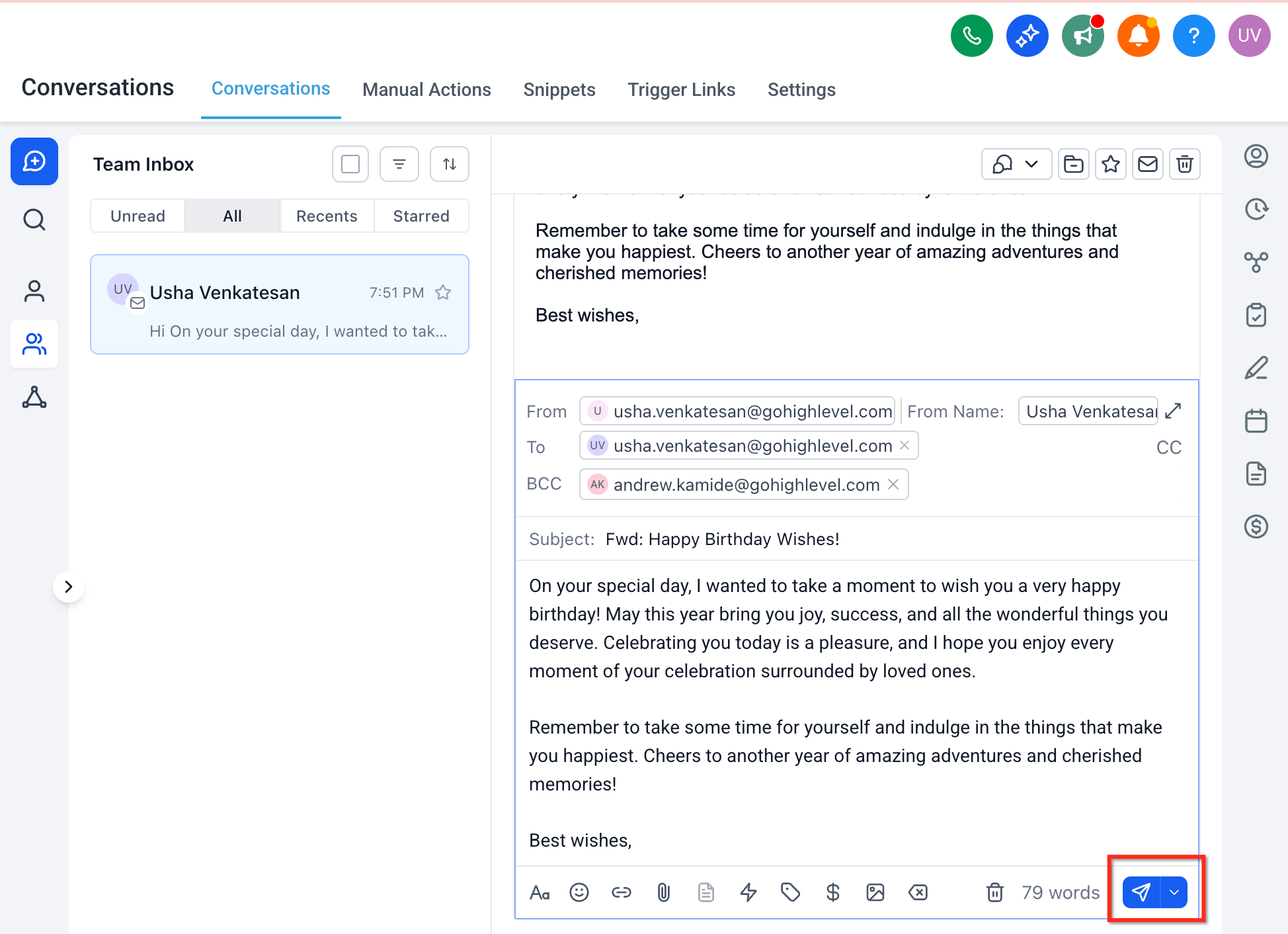 Forward inbound emails directly from the Conversations inbox to any external recipient without leaving HighLevel. This guide explains what forwarding does, how it behaves in a conversation thread, and how to set it up for smooth escalations, reviews, and handoffs—all while keeping Conversations your single source of truth.