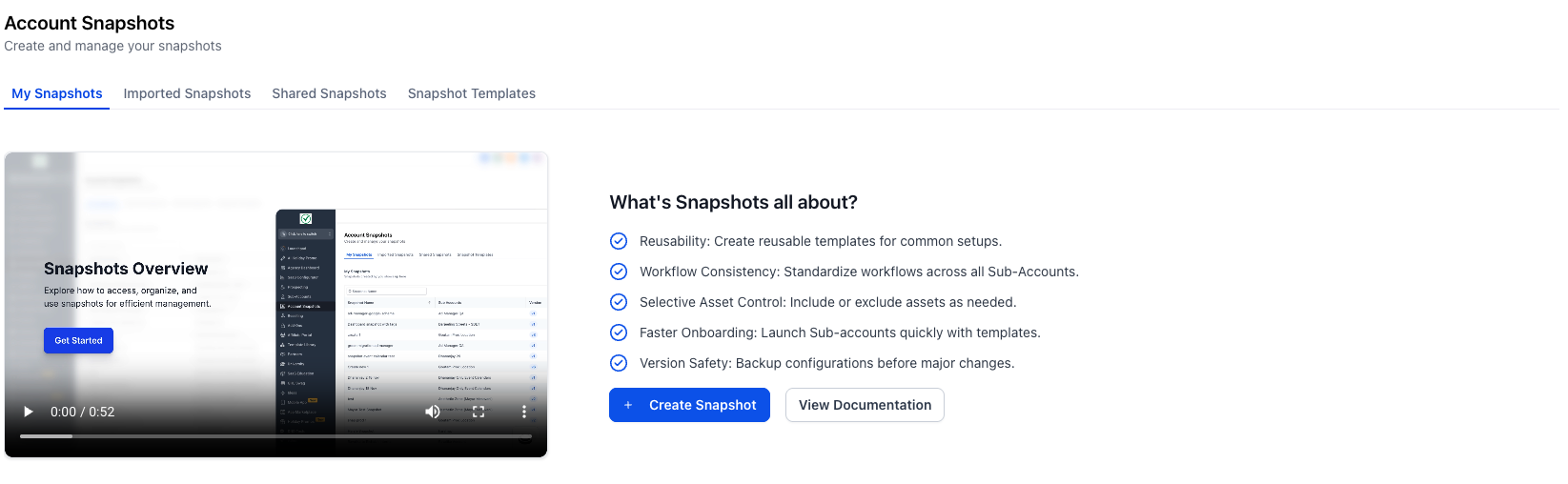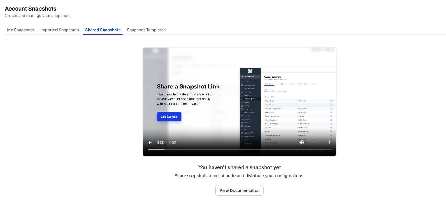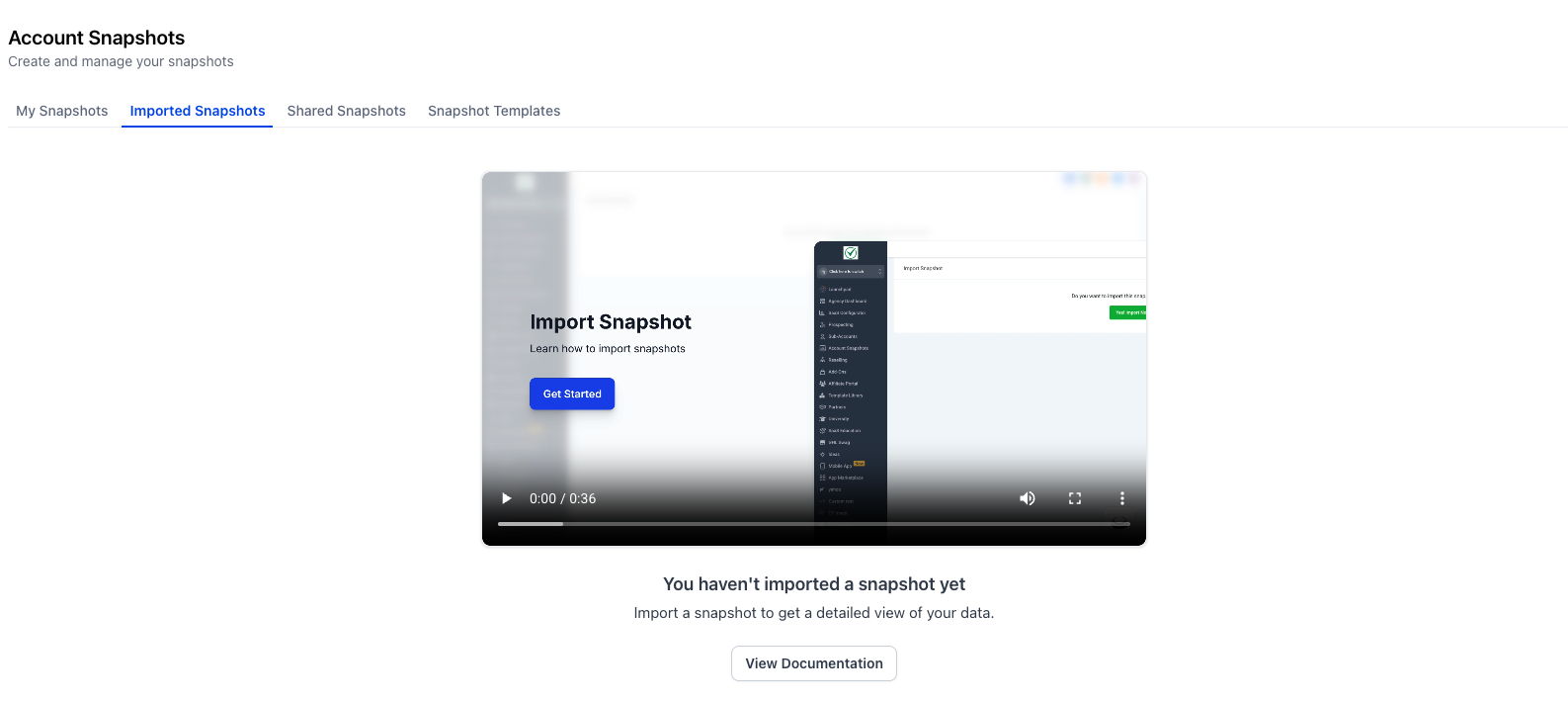 The Integrated Onboarding Experience appears when you open Agency View → Account Snapshots and have not yet created or imported a Snapshot. It presents quick explanations and learning resources so you can confidently complete your first Snapshot workflow and reference help again whenever needed.