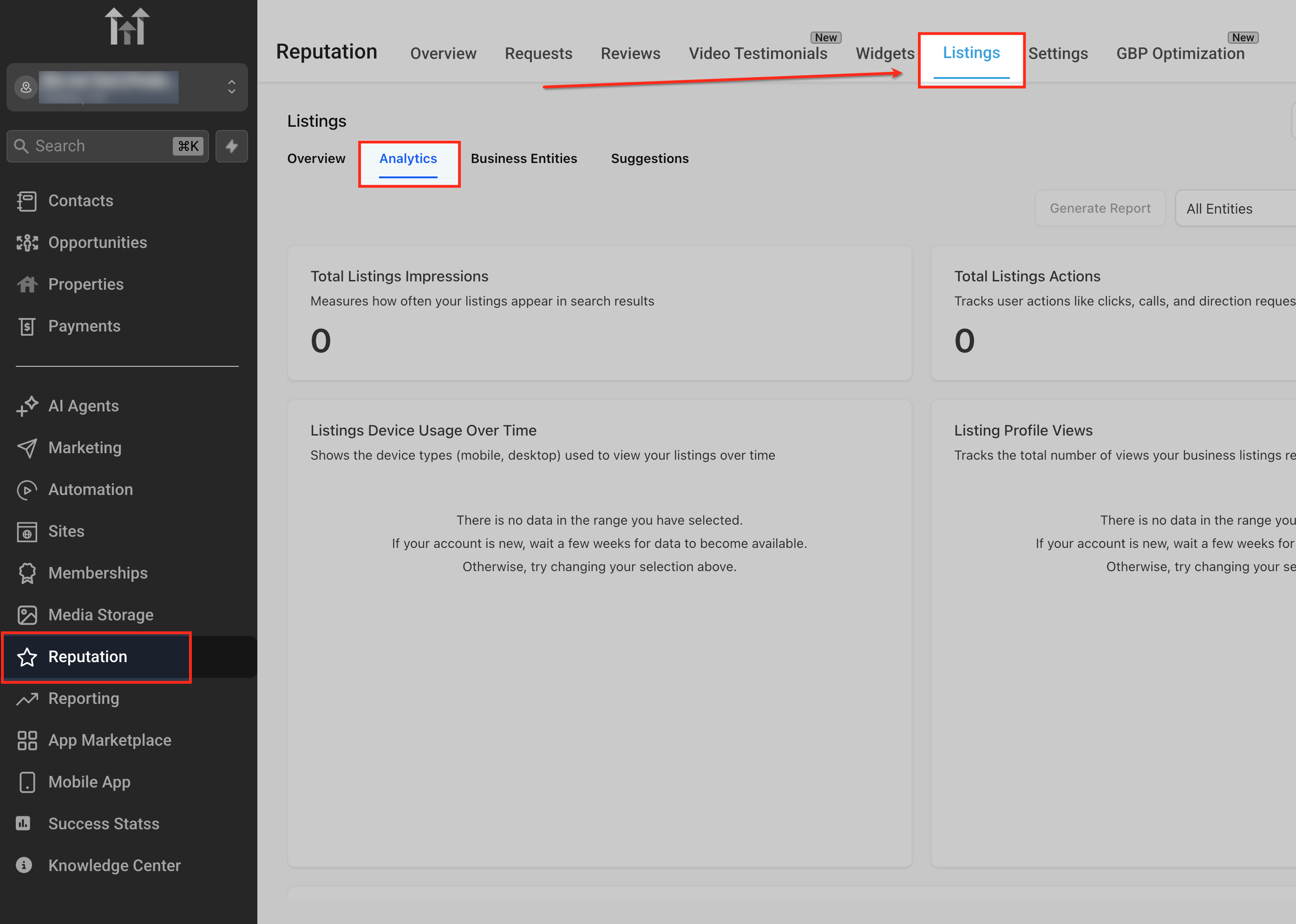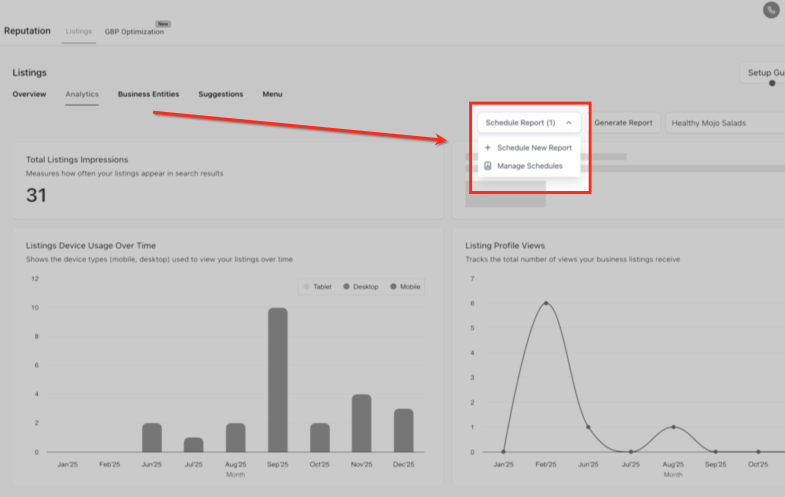 From the left navigation menu, click Reputation, then select Listings and open the Analytics tab. This is where you can view listings performance data and access reporting options for scheduling automated recap reports.