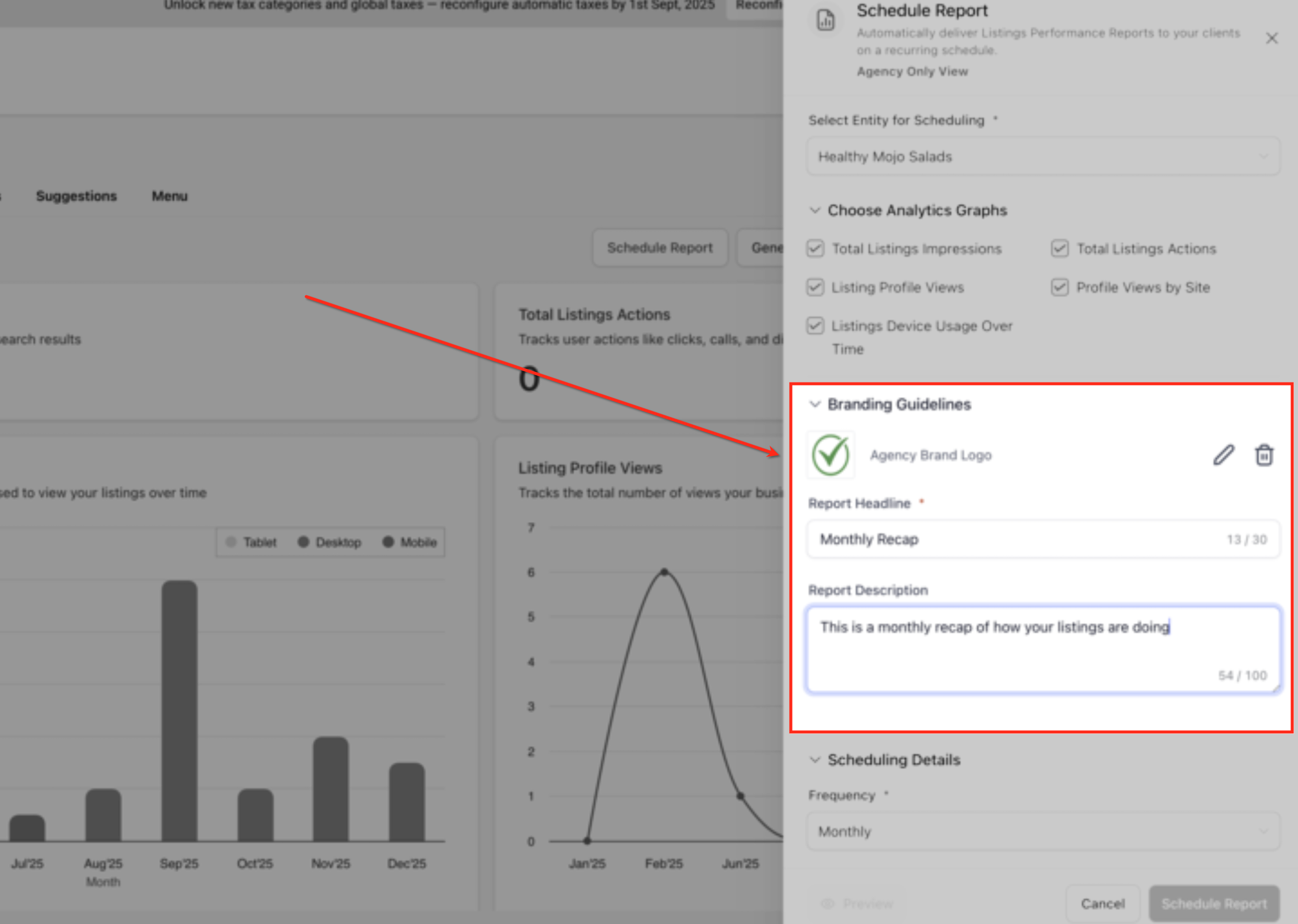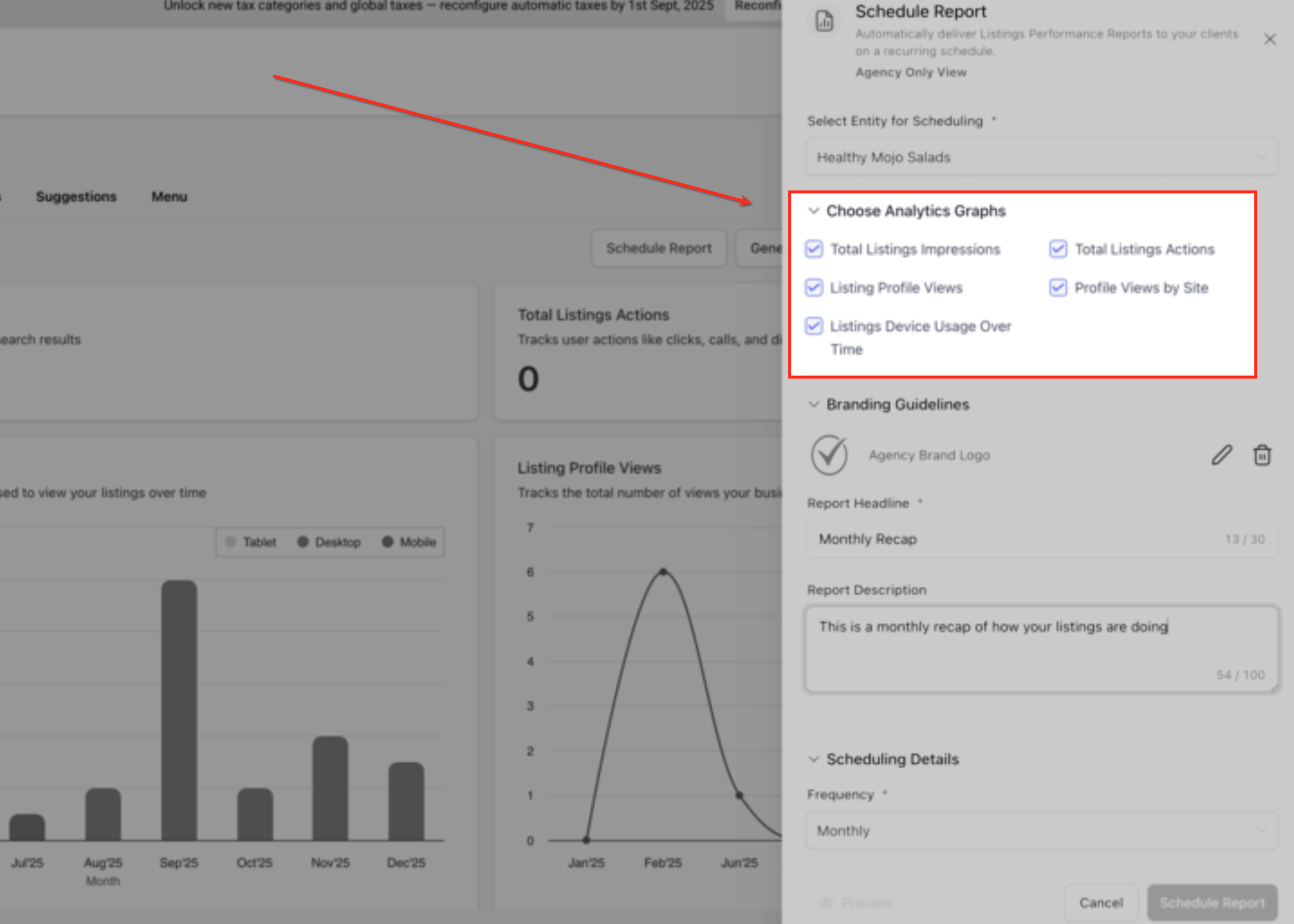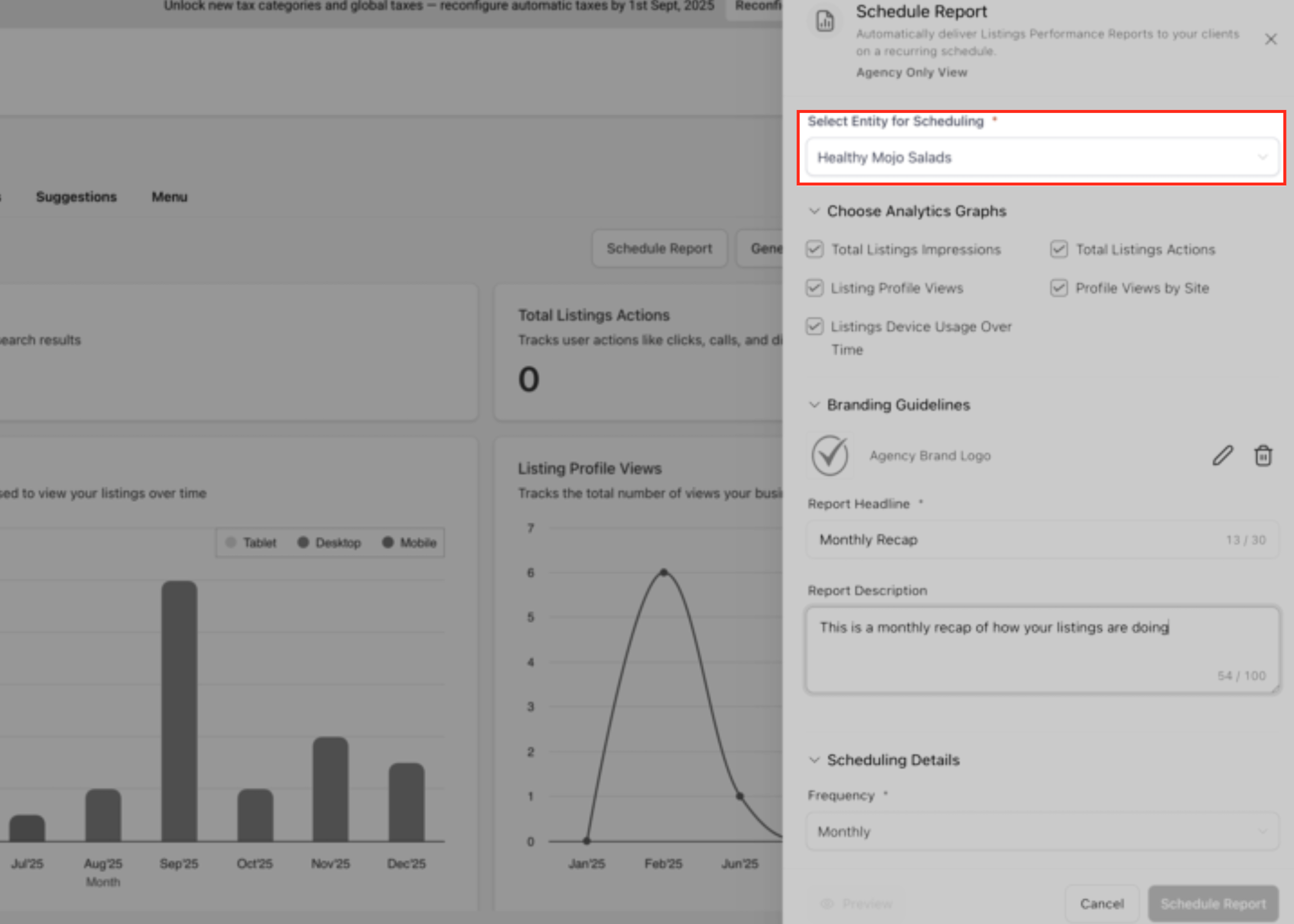 In the Schedule Report panel, use the Select Entity for Scheduling dropdown to choose the business location or entity for which the report will be generated. This ensures the performance recap pulls analytics and listings data for the correct business.