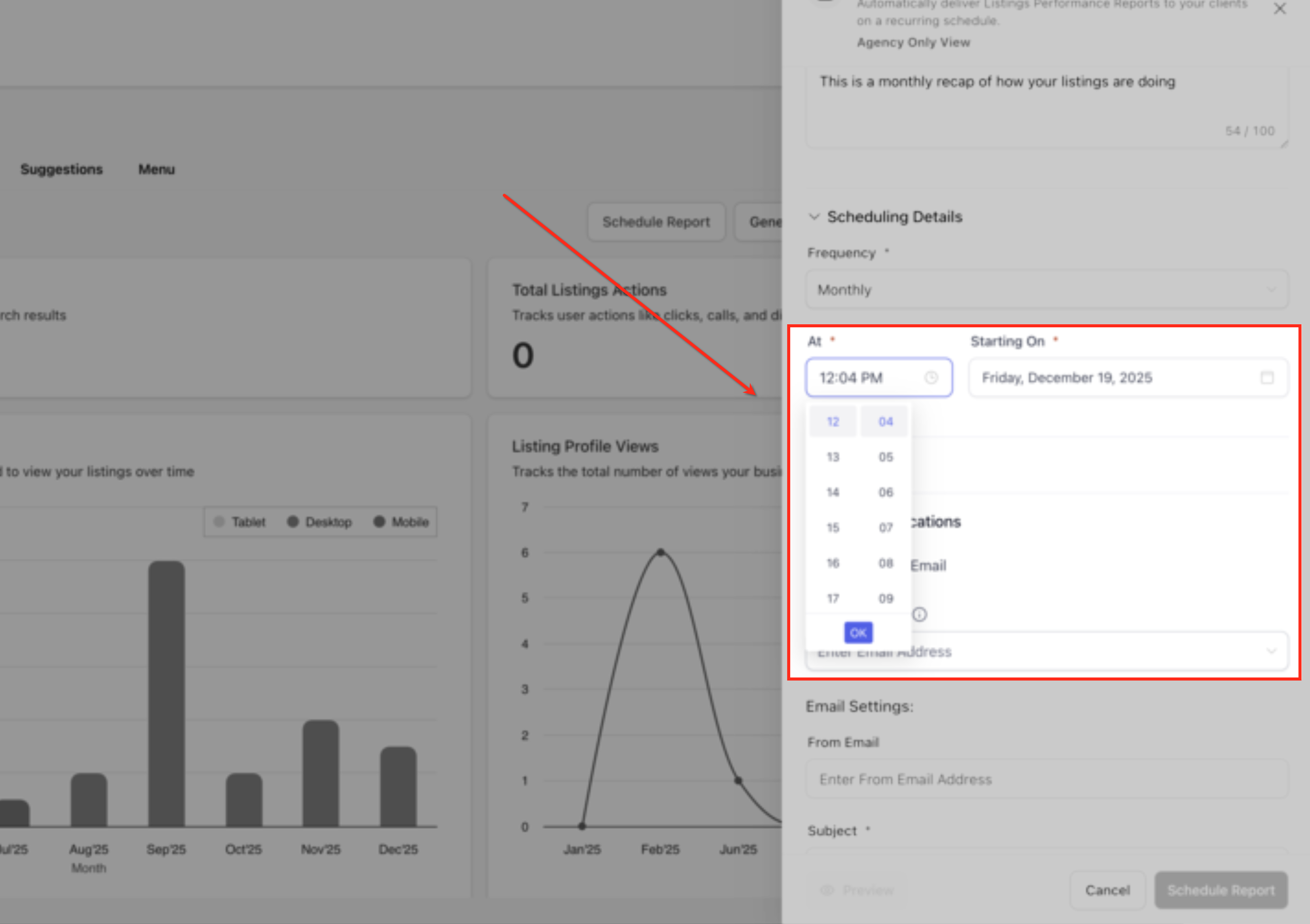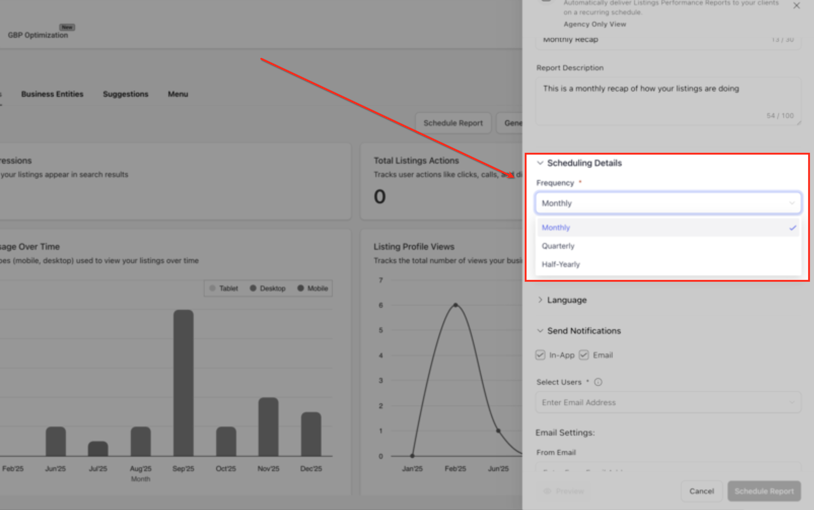 In the Scheduling Details section, choose how often the performance recap should be sent—Monthly, Quarterly, or Half-Yearly. The selected frequency controls the reporting period and determines when recipients receive updated listings performance summaries.