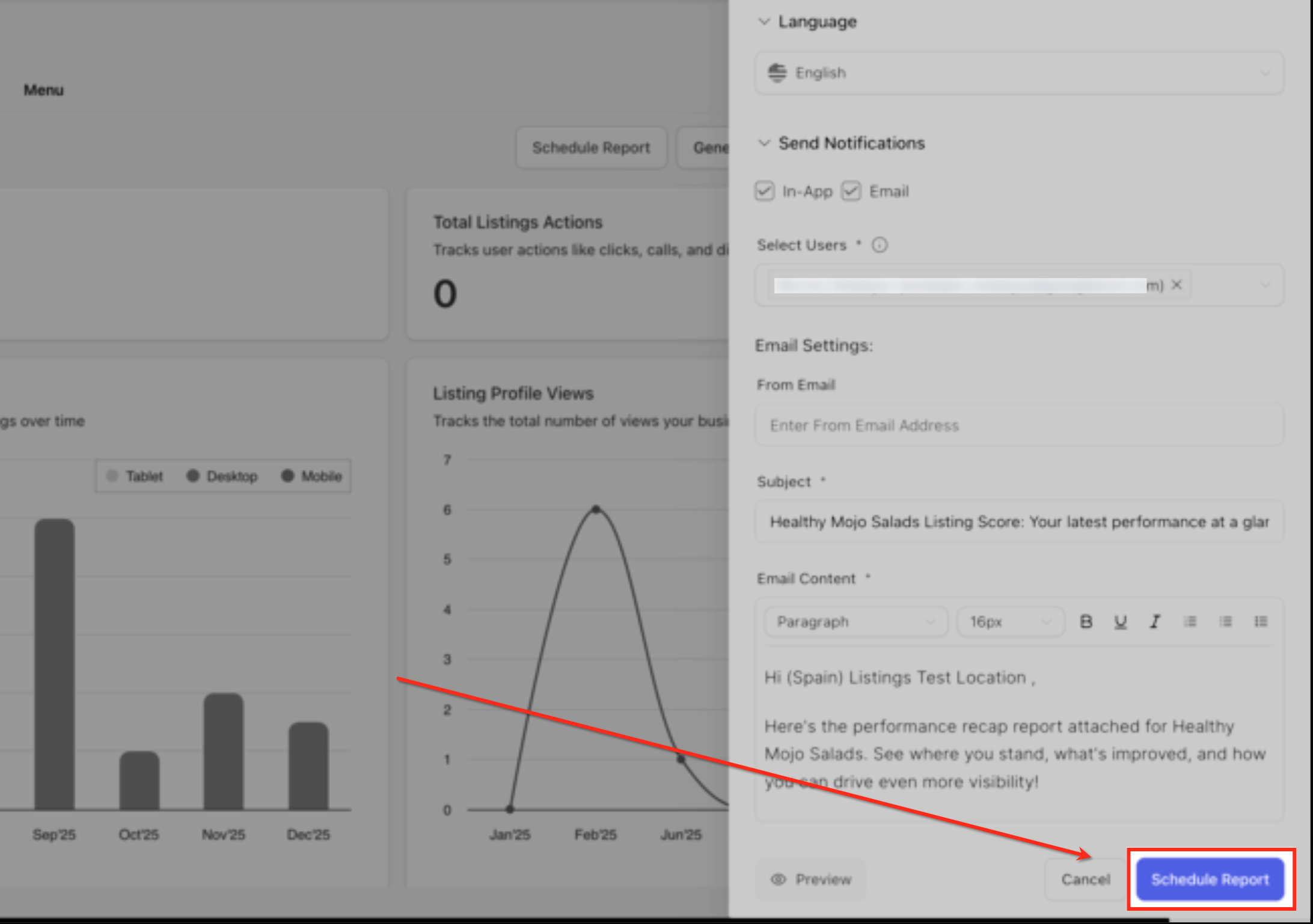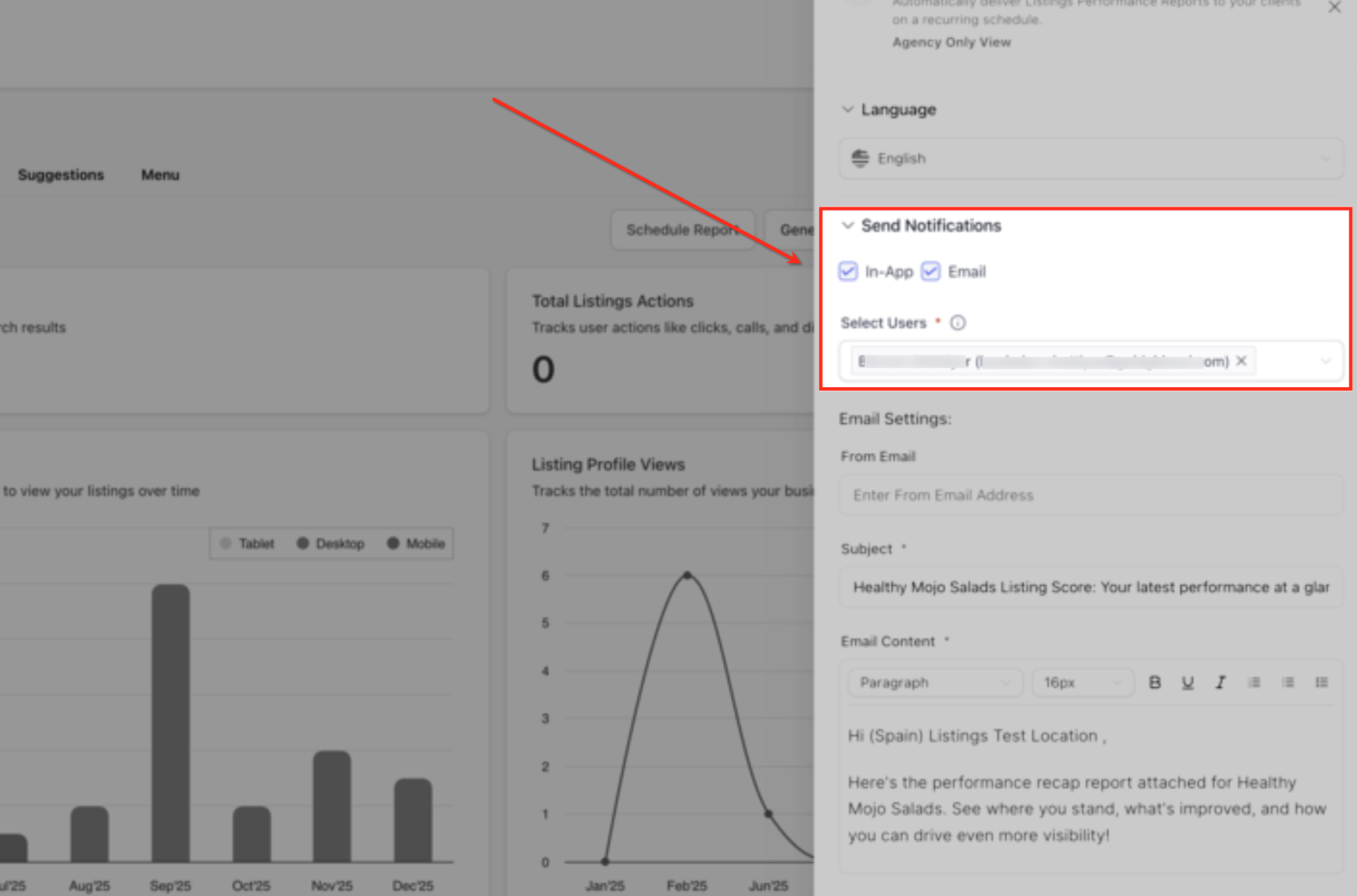 In the Send Notifications section, choose whether the report should be delivered via In-App, Email, or both. Then select the users or email addresses that should receive the automated listings performance recap.