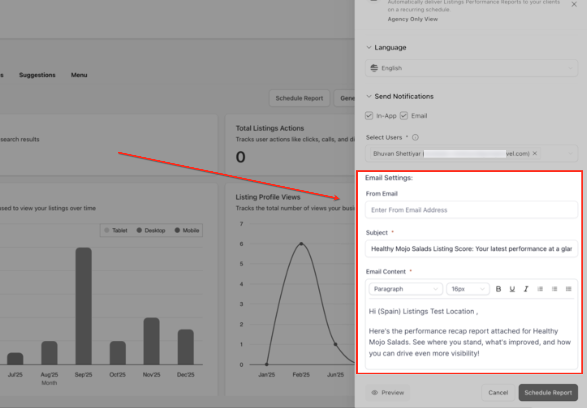 In the Email Settings section, enter the From Email, customize the Subject, and review or edit the Email Content that recipients will see. These settings control how the listings performance recap email is branded and communicated when delivered via email.