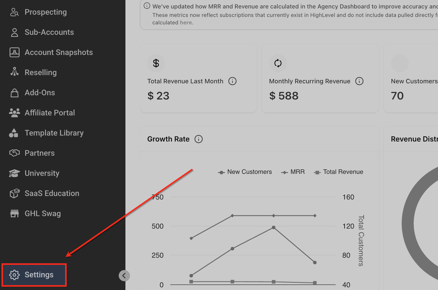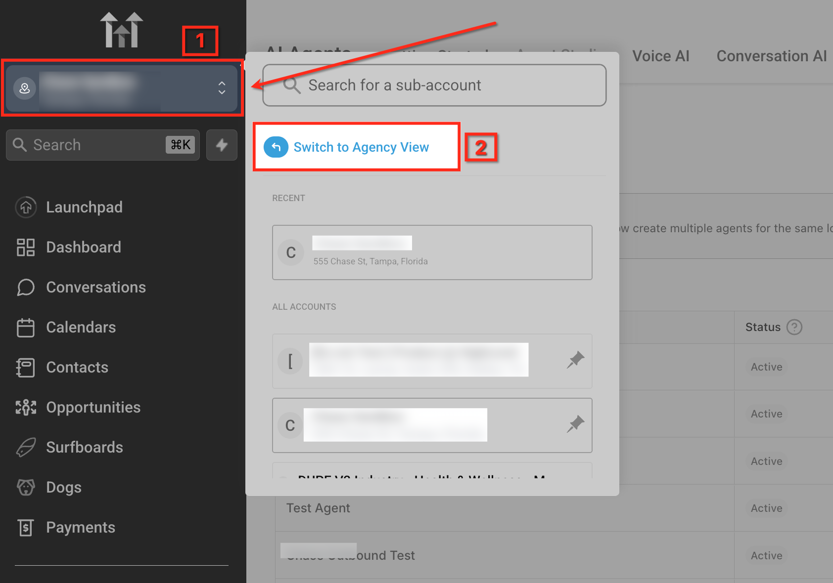 From the left side menu, click the sub- account selector dropdown, click "Switch to agency View"