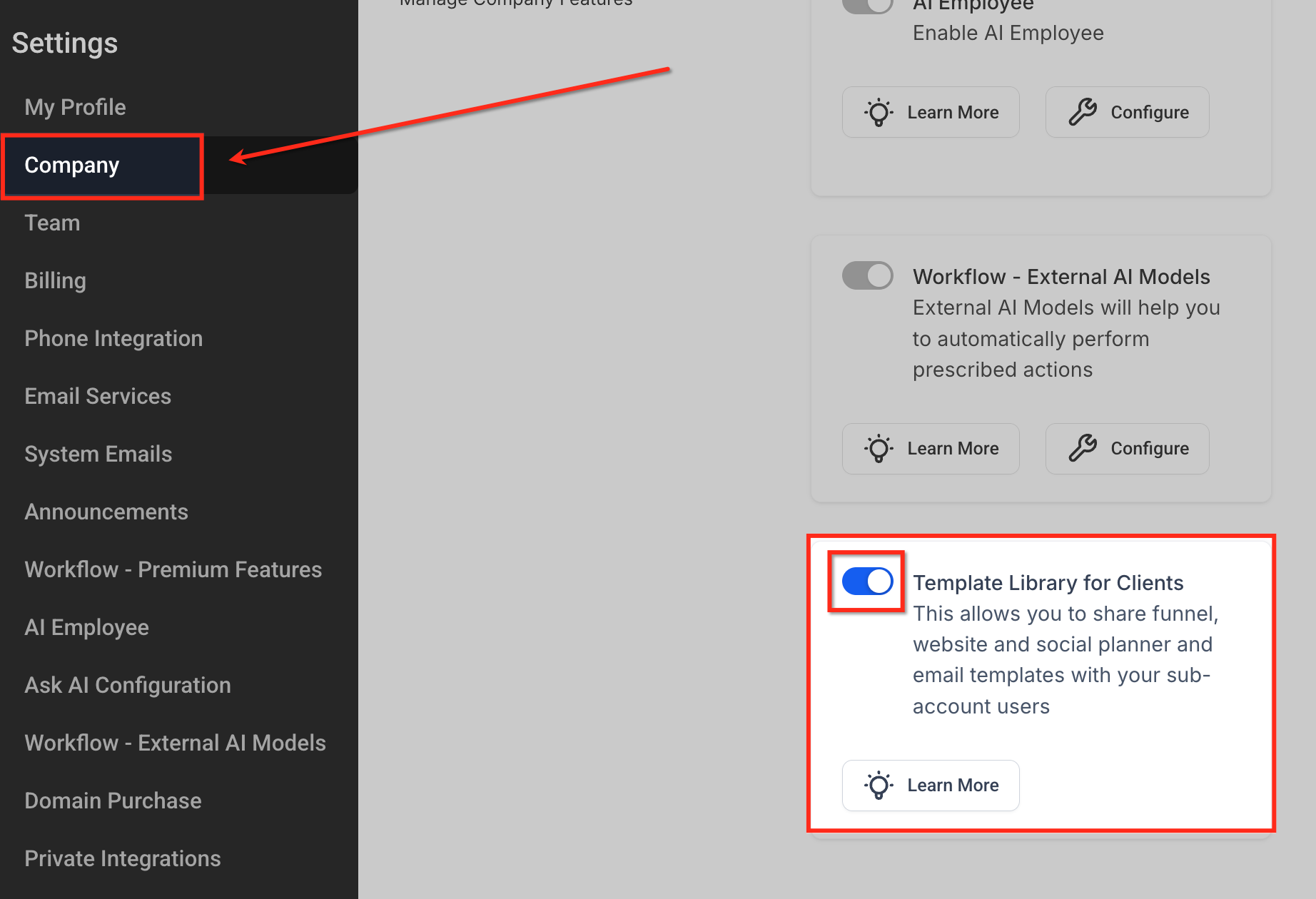 Enabling the agency-level toggle and confirming permissions ensures your team can access the Template Library and, if eligible, publish new templates for distribution.