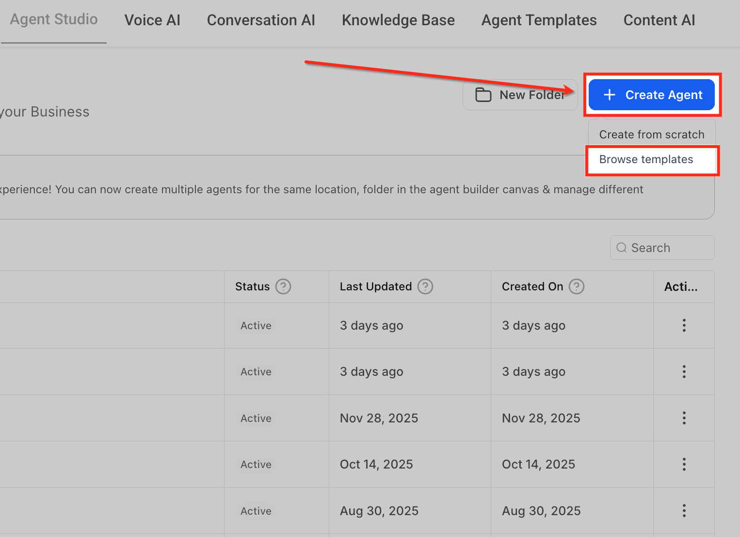 Go to AI Agents → Agent Studio to see the agent listed with Status, Last Updated, and Created On columns.