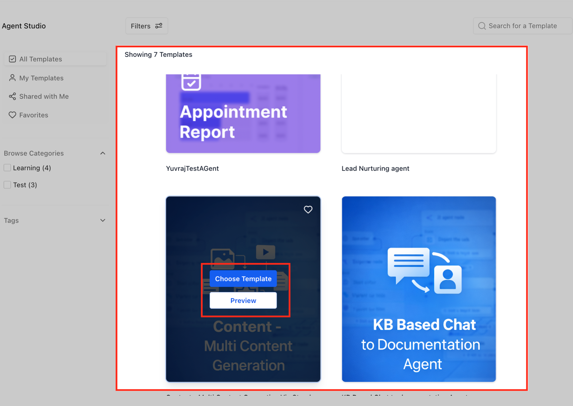 - Choose Template: This button initiates the process of Installing a copy into your Agent Studio as a new agent draft you can immediately edit.