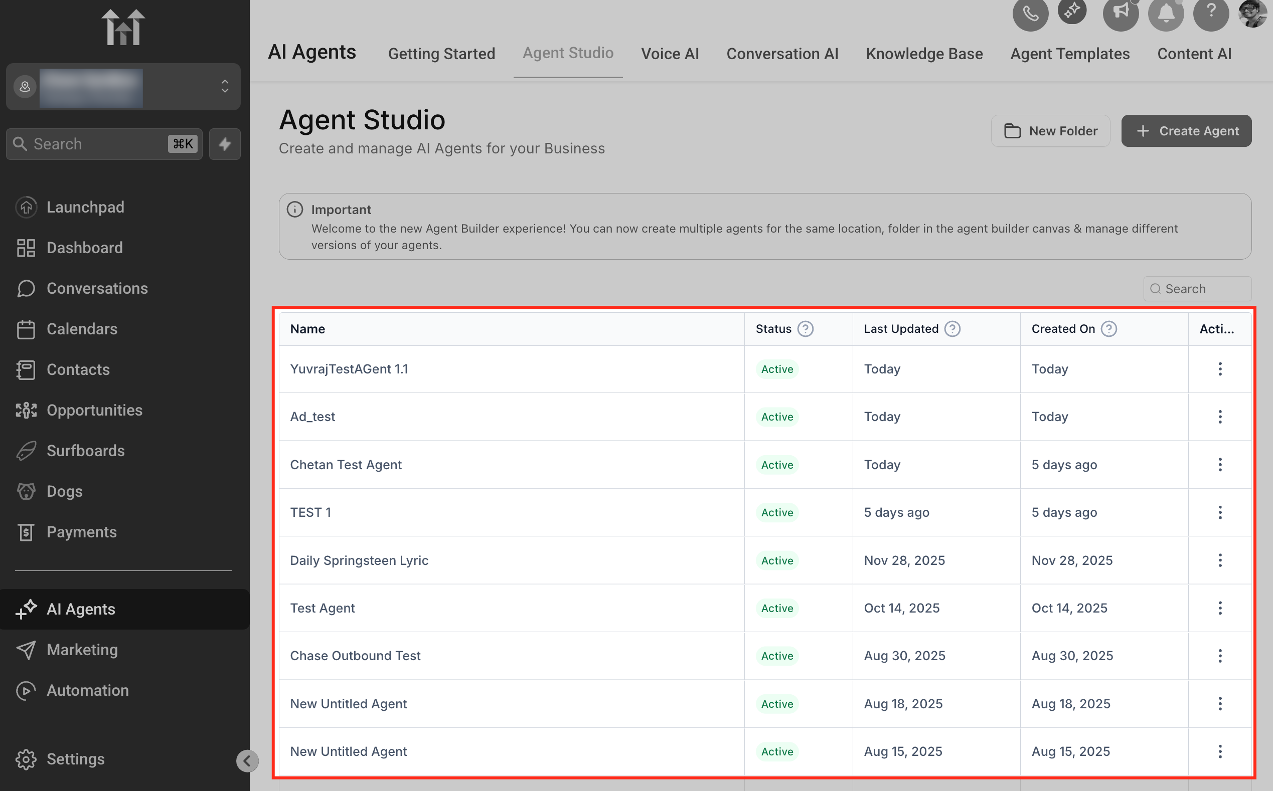 Open AI Agents → Agent Studio; the new agent appears in the list view.