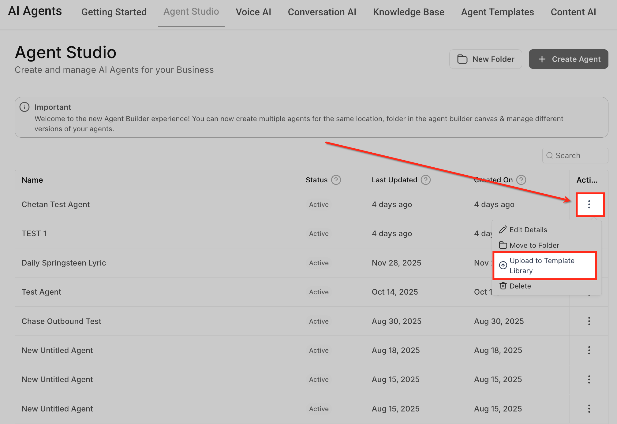 Agency Admins on the Pro plan ($497/mo) can publish templates. From Agent Studio, use the ⋯ → Upload to Template Library option on a proven agent, complete details, and publish.