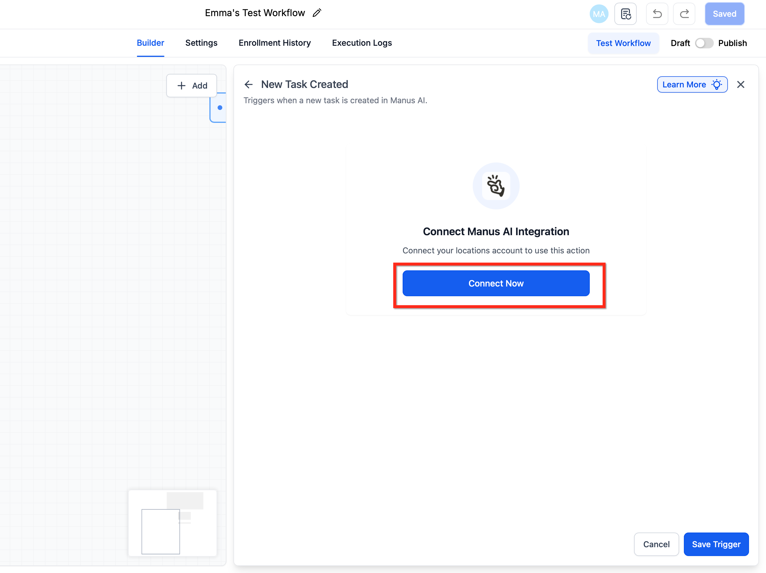 - In HighLevel, open Automation → Workflows and add any Manus action or trigger.