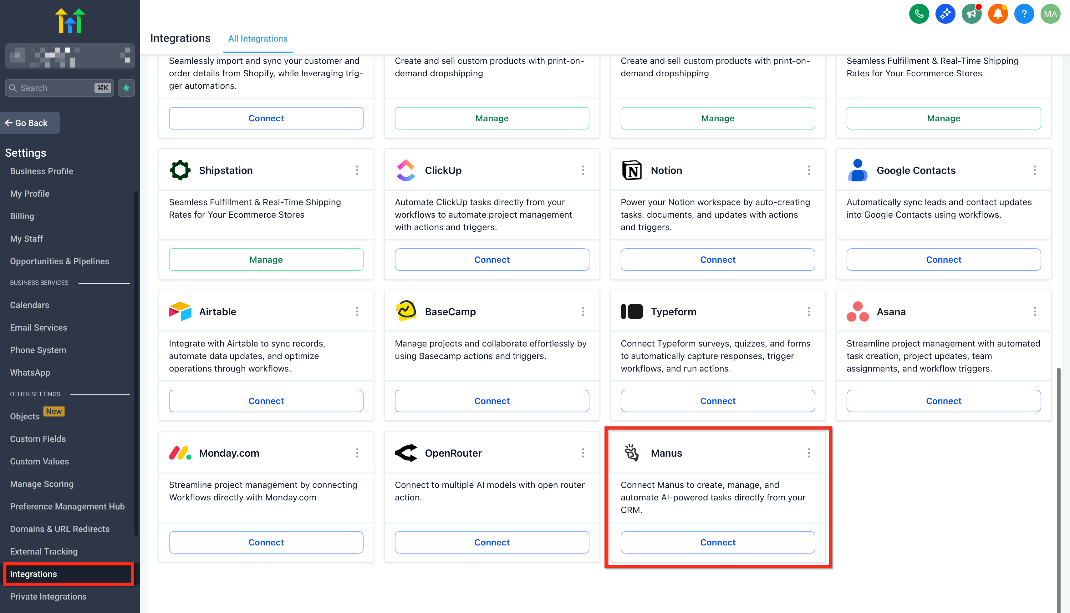 A one-time connection allows HighLevel to securely communicate with Manus via API authentication.