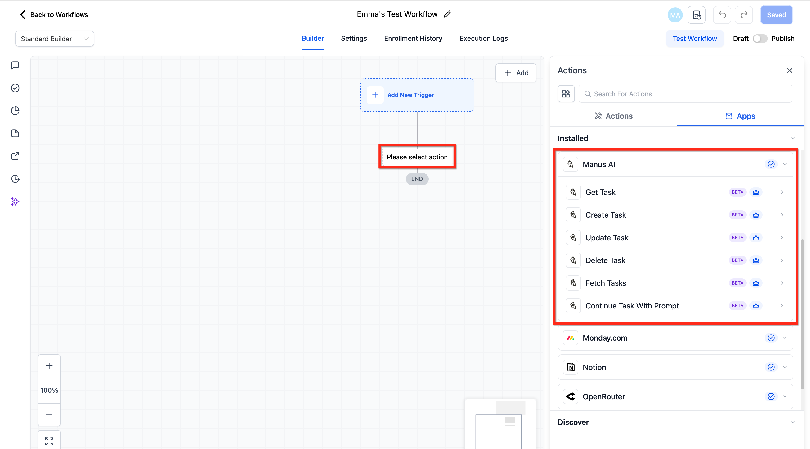 Manus actions allow you to control AI task execution directly from within a workflow.