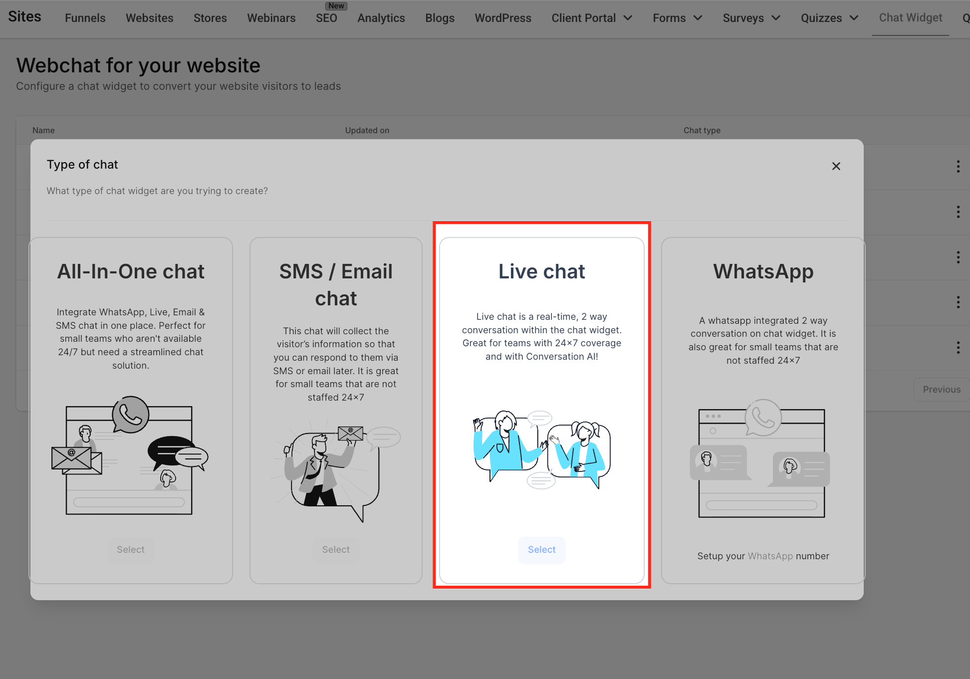 When selecting the chat type, choose Live chat. Although the setup screen displays “Live chat,” this option configures the Web Chat channel that routes website messages into Conversations.