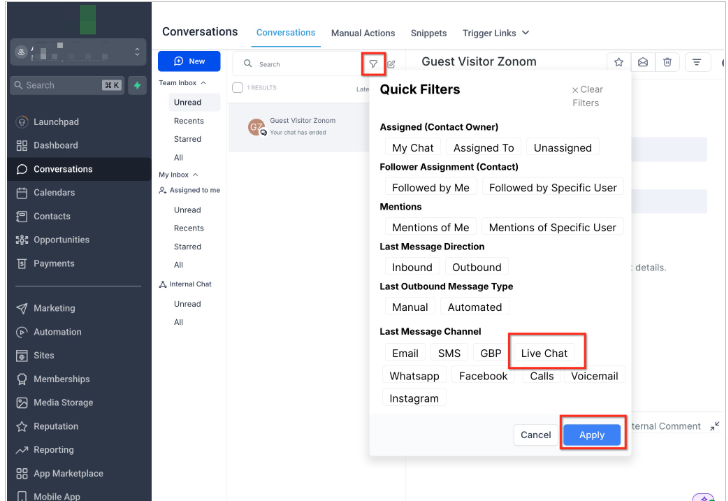 Under Last Message Channel, select Live Chat and apply the filter. This displays only Web Chat conversations originating from your website.