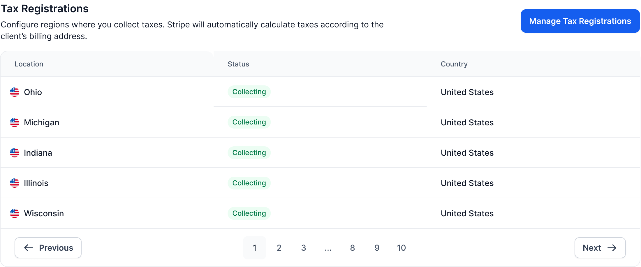 Add or manage the jurisdictions (countries/states) where you are required to collect taxes.