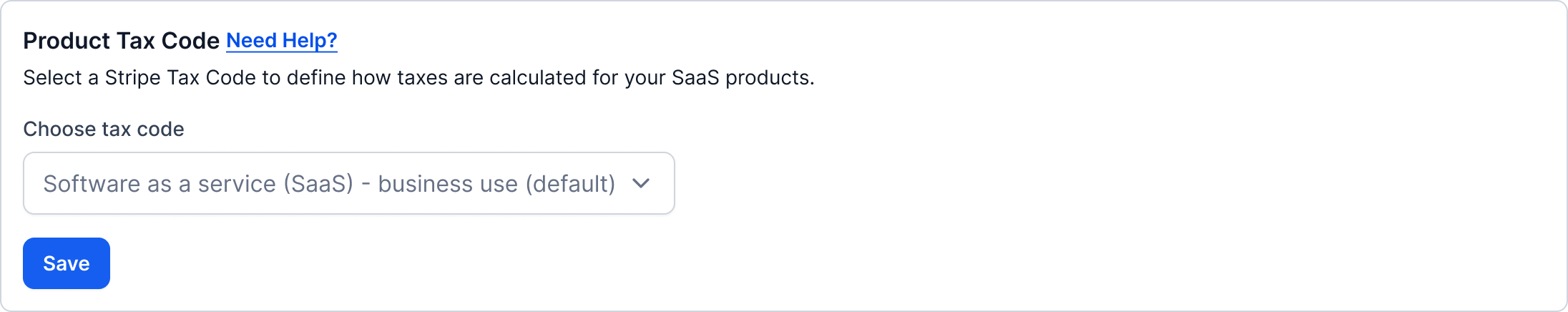 The selected tax code determines how Stripe calculates taxes for your SaaS products. Choose a tax code based on the type of product you sell and guidance from your local tax consultant.