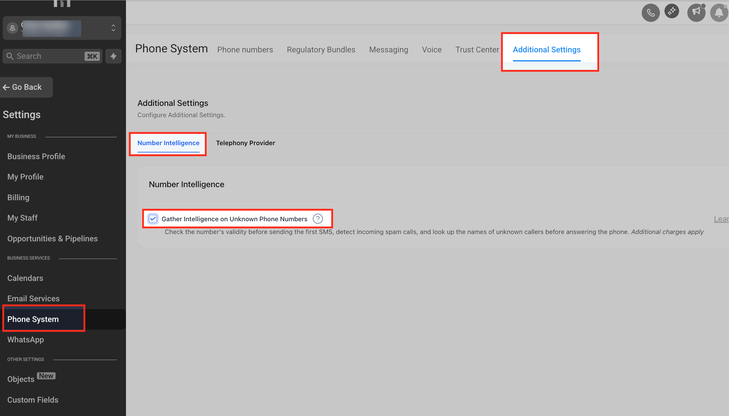 - Where to enable: Settings → Phone System → Additional Settings → Number Intelligence (sub-account).