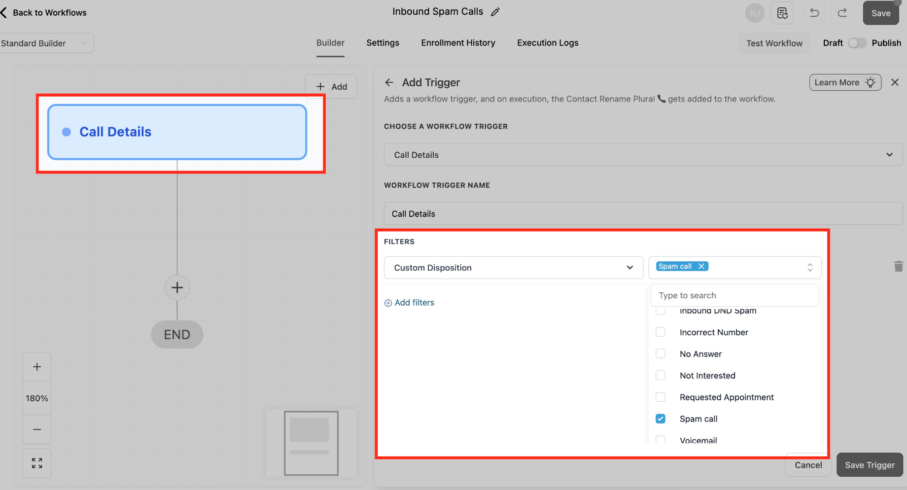 Trigger: Call Details → Filter: Disposition = Spam call (Direction optional).
