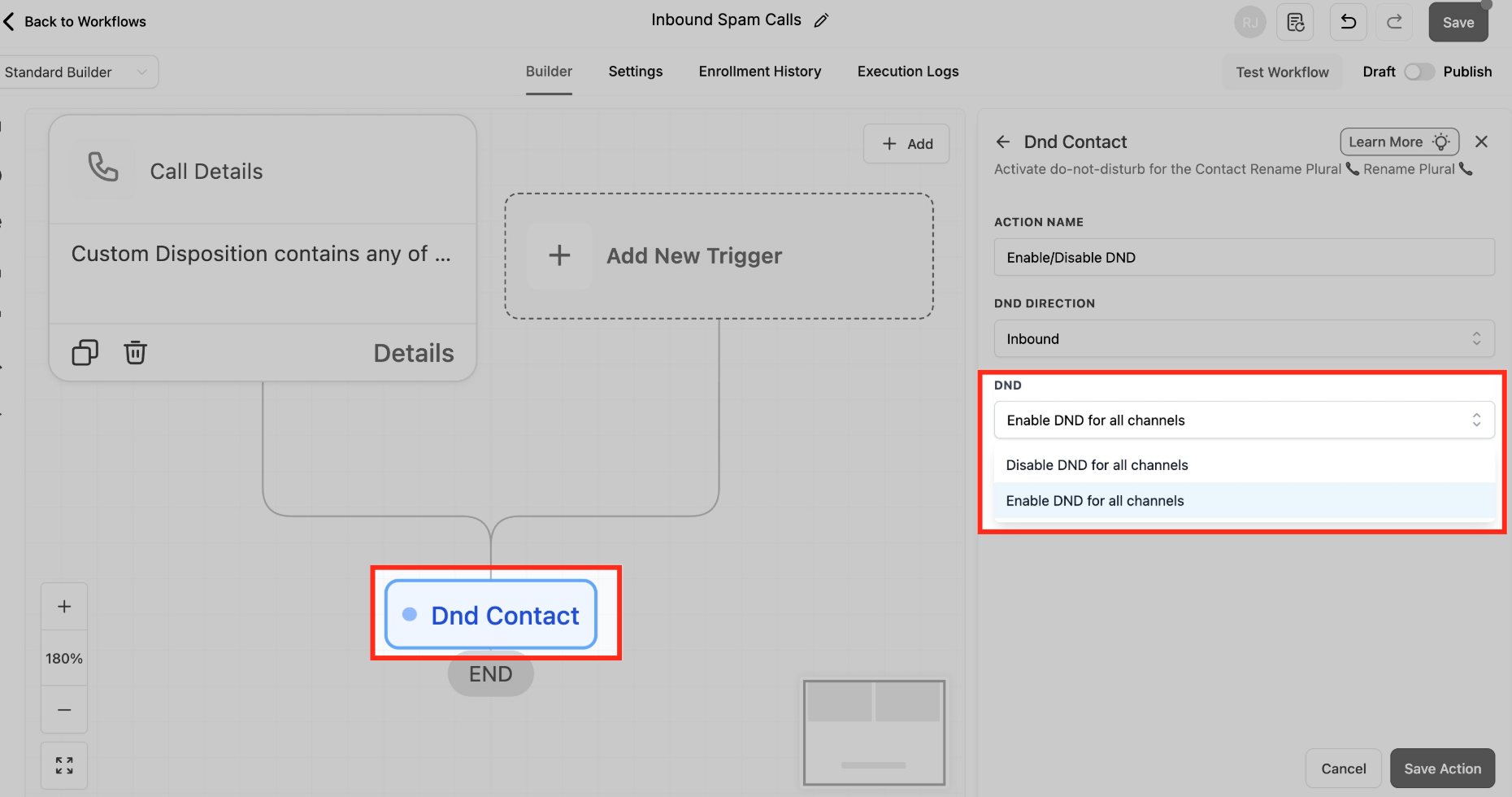 Action: Enable/Disable DND → Direction = Inbound → Channels = Voice → Save & Publish.